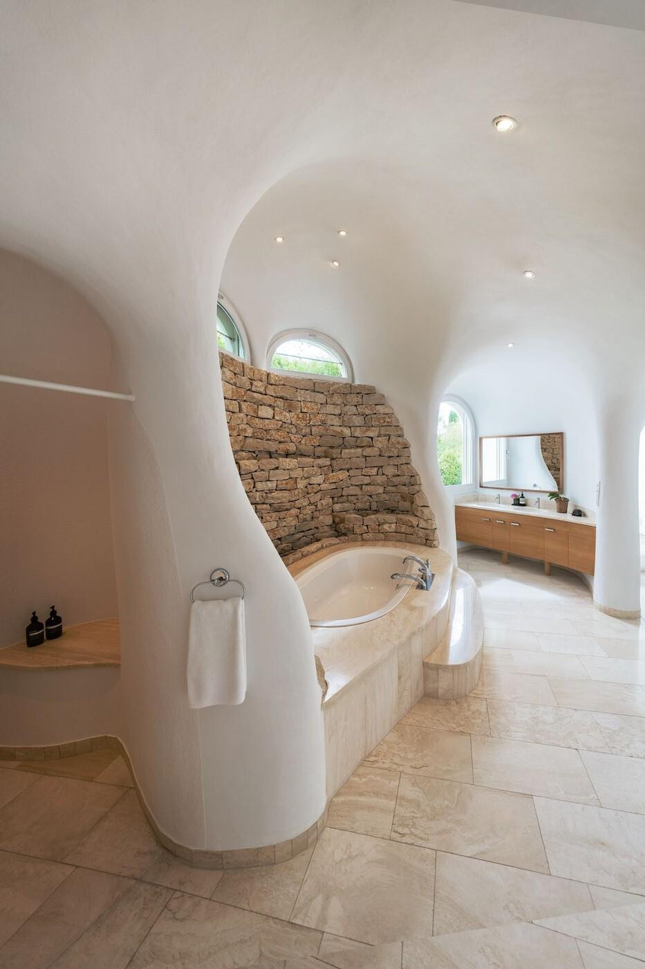 Na prvi pogled gotovo neprimjetne, te ‘ukopane kuće‘ skrivaju se pod travnatim krovovima i stapaju s brežuljkastim krajolikom, stvarajući dojam da priroda u potpunosti obavija arhitekturu. Riječ je o projektu koji spaja održivu gradnju i suvremeni dizajn, a nastao je prema konceptu arhitekta Petera Vettera, pionira ‘earth-house‘ pokreta. Ideja je jednostavna, ali vizualno impresivna: život (djelomično) pod zemljom, s dovoljno svjetla i zraka, koji nudi toliko udobnosti da prostor uistinu ‘diše‘ kao dom, a ne kao podzemno sklonište.