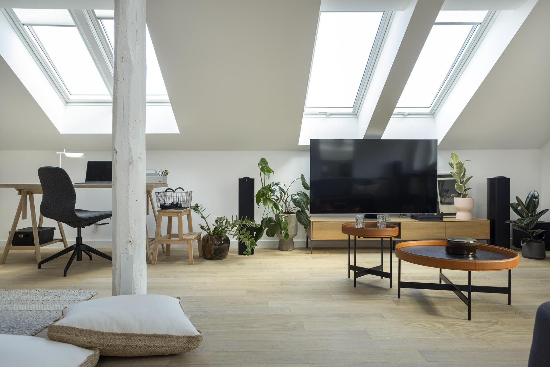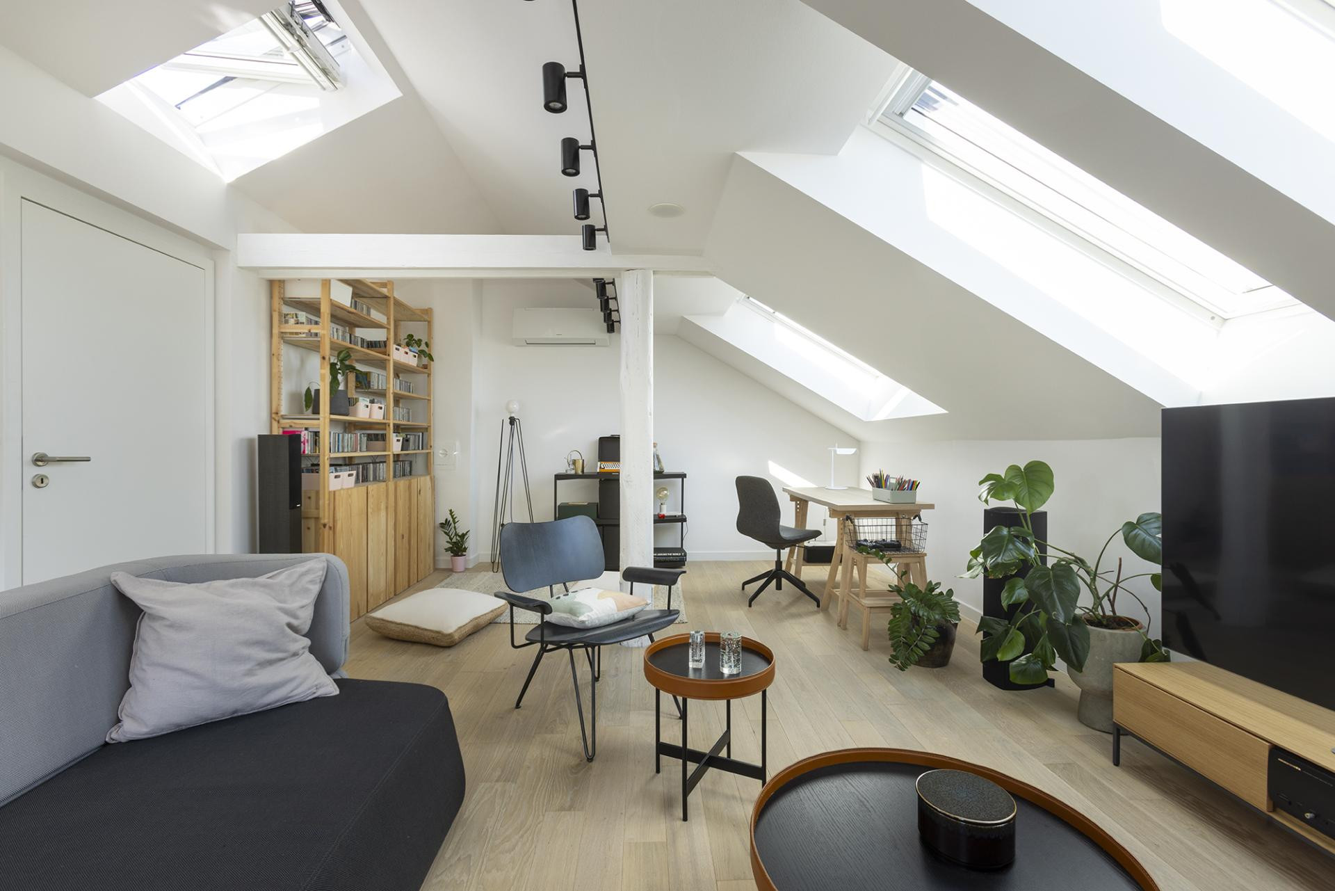 Nekada mračan i nizak prostor pun kutija pretvoren je u prozračan, multifunkcionalan dio doma, idealan za gledanje filmova, igru, rad od kuće, čitanje i druženja s prijateljima. Uz pomoć čak osam VELUX prozora, potkrovlje je dobilo potpuno novu dimenziju: obilje dnevnog svjetla, osjećaj prostranosti i stalni protok svježeg zraka.