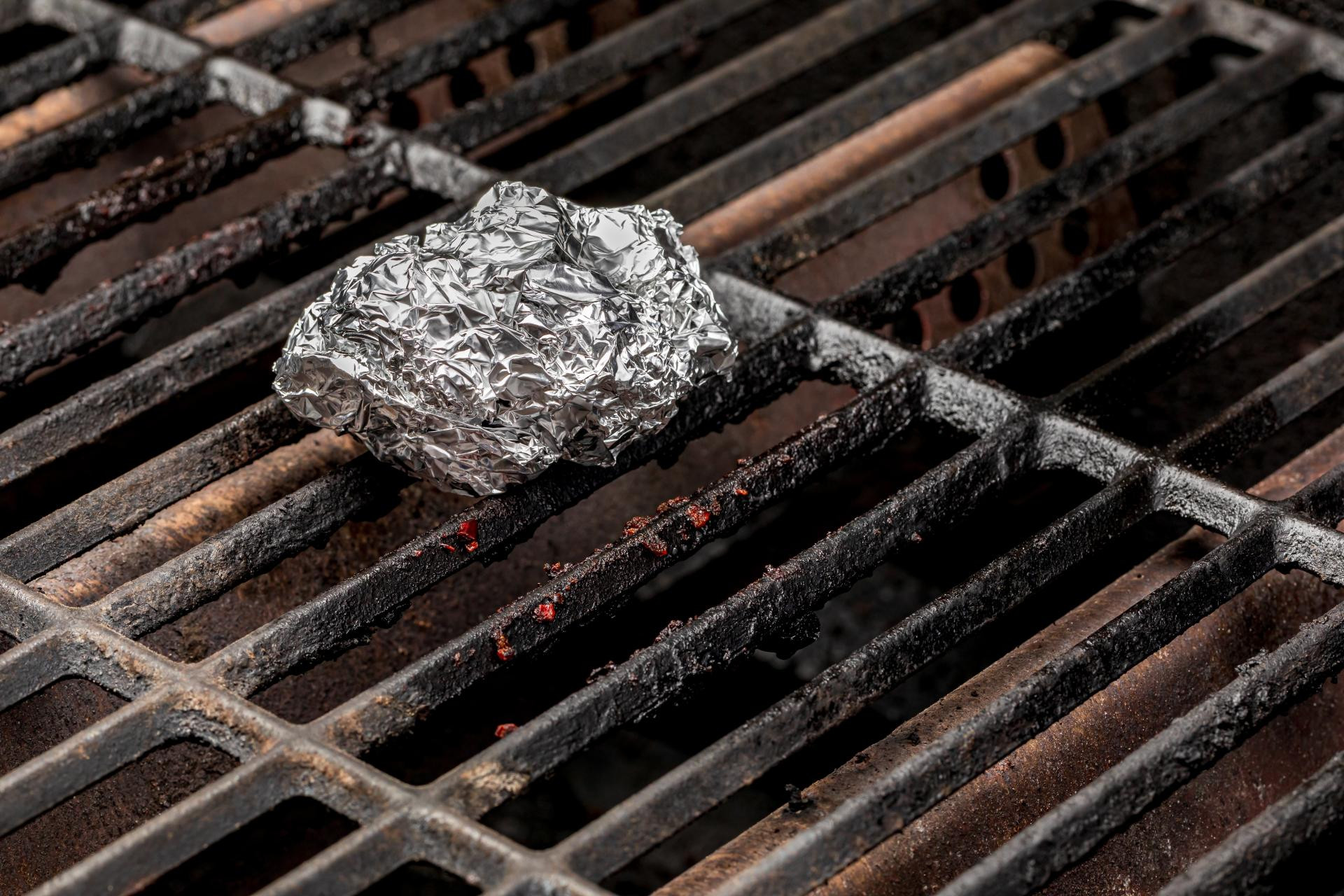 4. Uključite roštilj i stavite aluminijsku foliju izravno na rešetke. Zatvorite poklopac roštilja. Pustite da roštilj radi nekoliko minuta dok se rešetke ne zagriju i talog ne počne otpuštati. Uklonite listove folije, a zatim izribajte rešetke zgužvanom kuglicom folije.