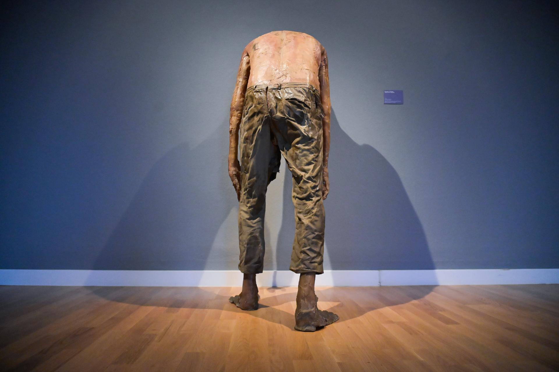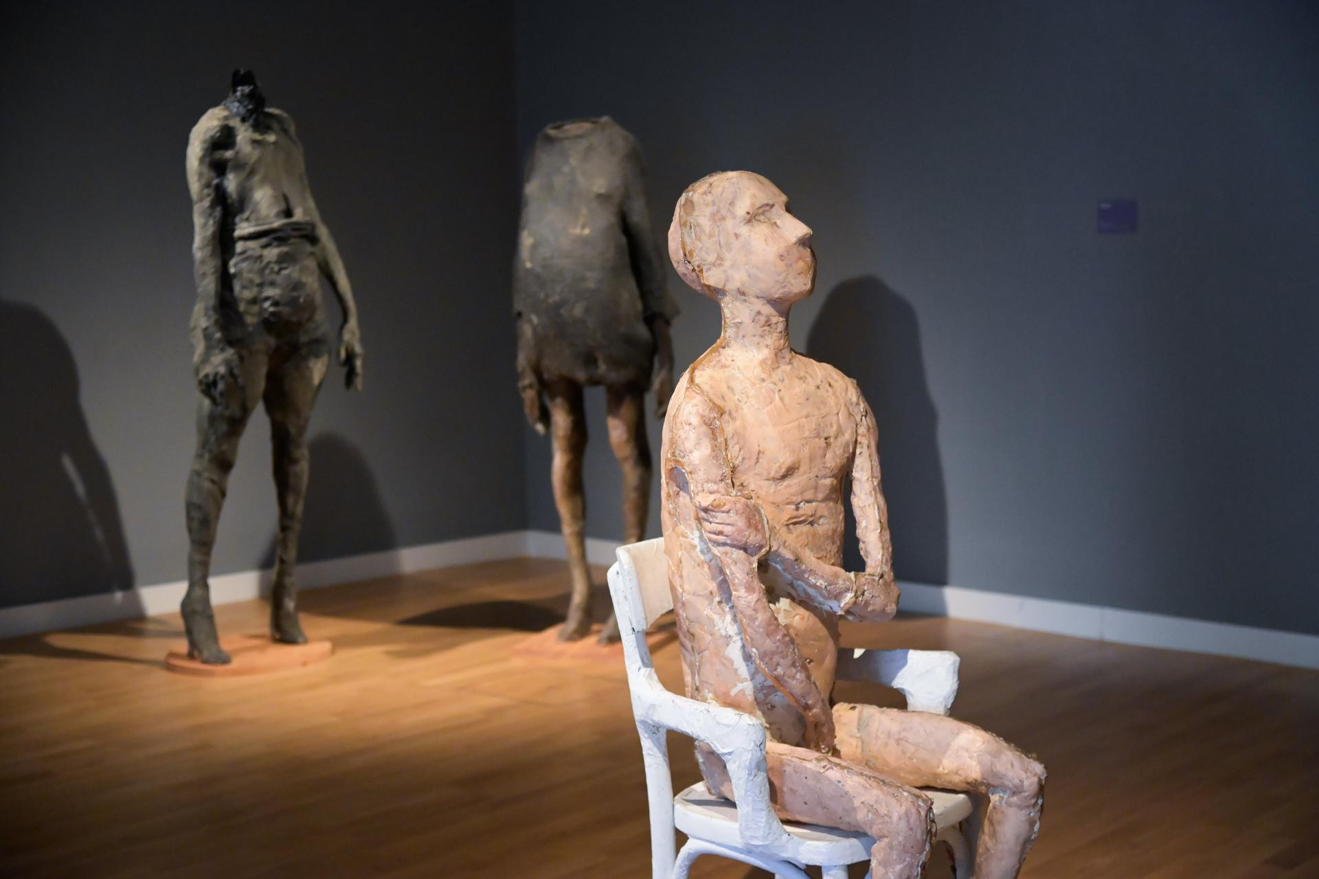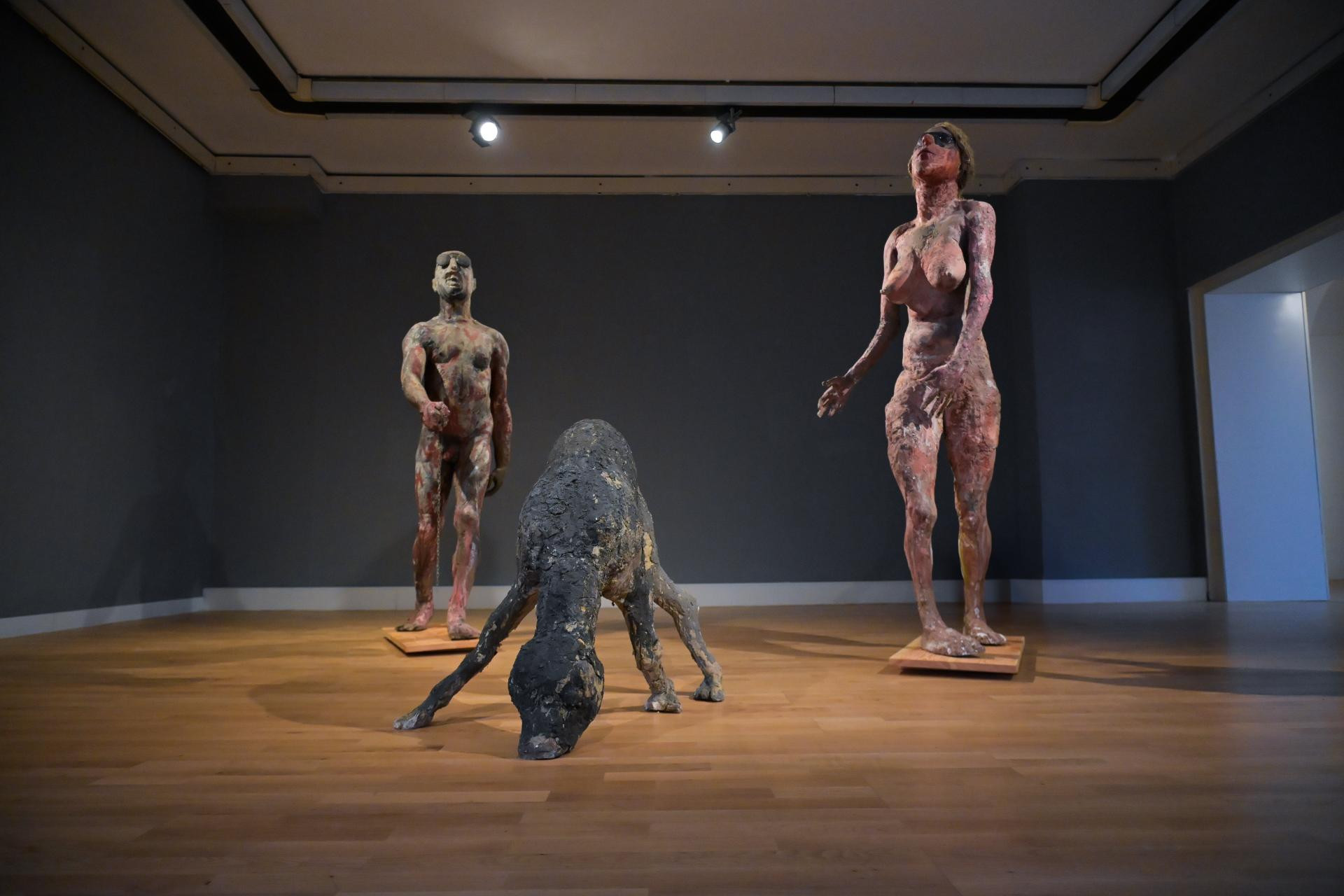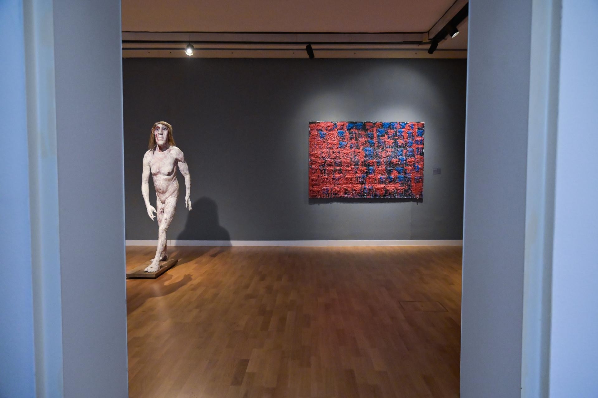 U postavu izložbe neke su sjedeće skulpture postavljene tako da gledaju oko slike. Izložba nazvana "Zatečeno stanje", napominju kustosi, nije kronološki postavljena. Zanimljiva je i potresna skulptura "Mlađi sin šefa policije" koja prikazuje muškarca, s djetetom u ruci, koji sjedi na stolcu, a sve je premazano blatom. Pa čovjek koji je zabio glavu o zid "Povratak iz Tunguzije", tko se od nas ponekad tako nije osjećao, i ja sama taj dan kad sam izložbu obilazila. Sve te figure, i kad su nage, egzistencijalističke su, svedene na tegobe, na preživljavanje, one pate, previjaju se, u grču su, mnoge su i nage, no nemaju erotskih konotacija. Potom skulptura "Dubeći na glavi". Pa "Čopor vukova", monumentalno djeluje u galerijskom prostoru. Na kraju su i neke vesele, šarene figurice, neke ovdje pak imaju i erotskih konotacija, druge su pak porculanski anđeli. Od kanti boja autor radi skulpturu.