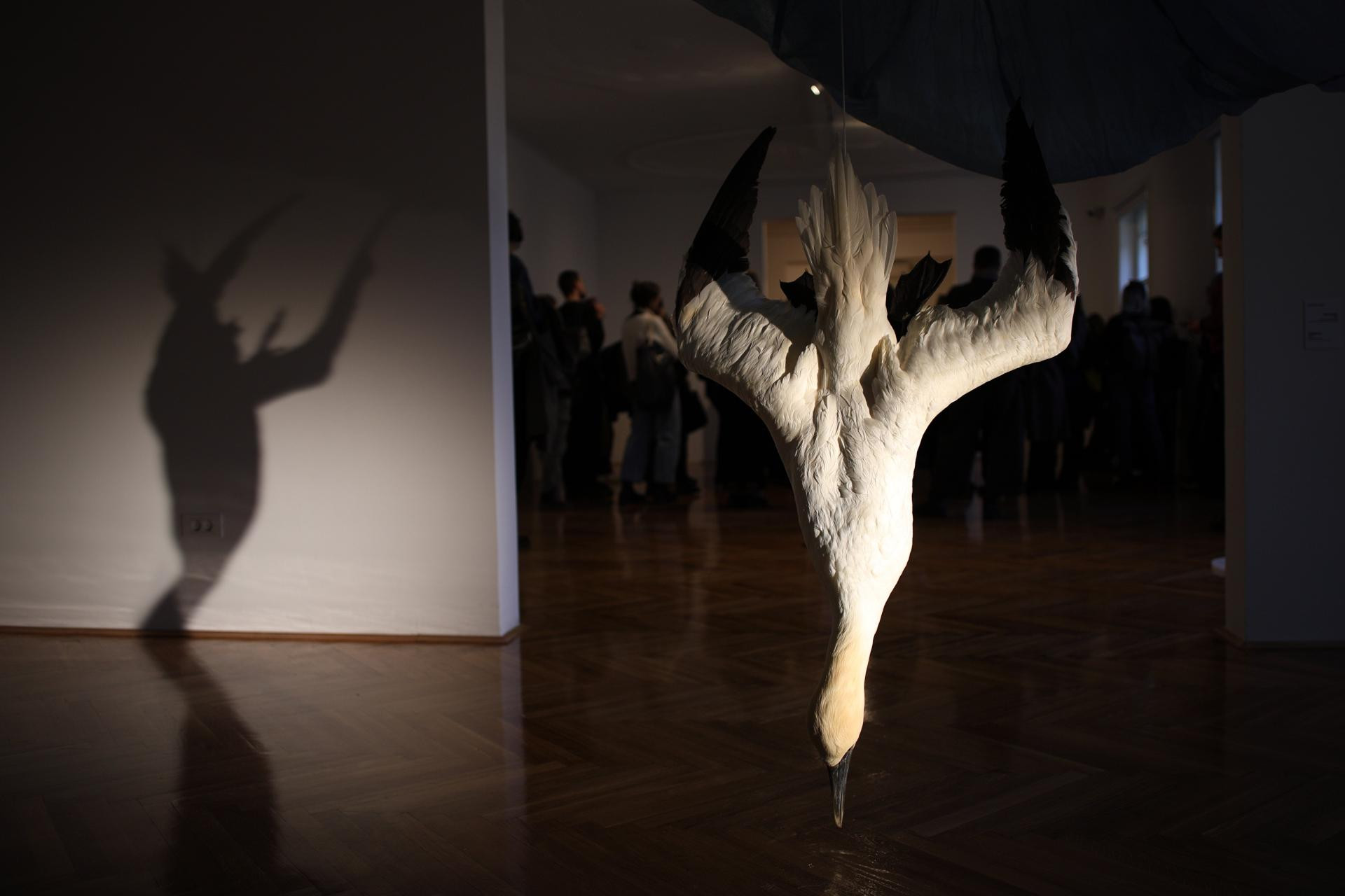 "Ovo je ptica koju sam pronašla mrtvu na plaži blizu svoje kuće na zapadnoj obali Irske, u regiji Connemara. Poznata je kao irski albatros. Ponekad te ptice uginu jer rone u plitkim vodama i slome vrat", tumači mi Dorothy Cross, jedna od najznačajnijih suvremenih irskih umjetnica, dok obilazimo njezinu izložbu "Kinship/Srodstvo" u zagrebačkom Arheološkom muzeju. Iznad ptice je plavi padobran.