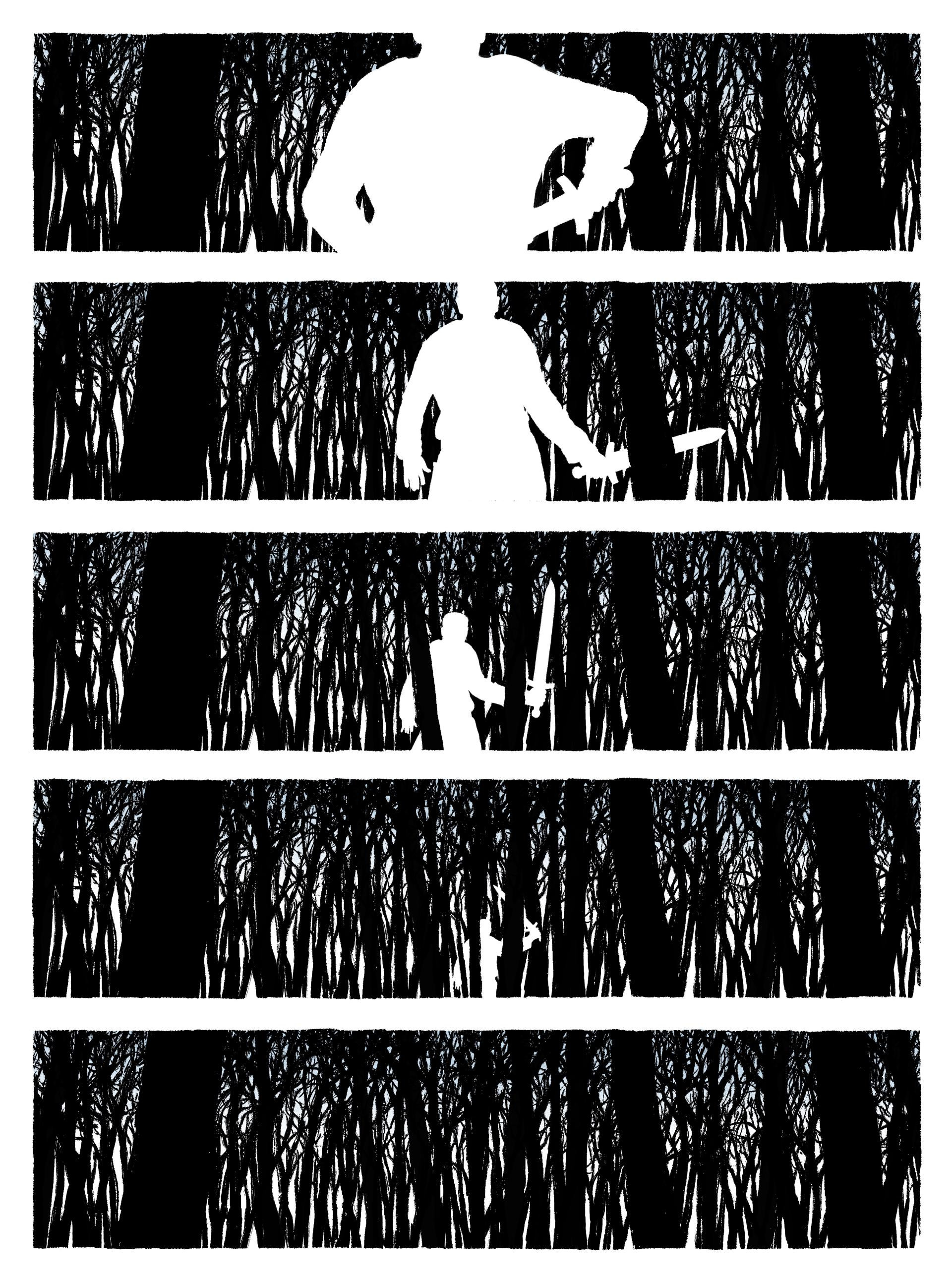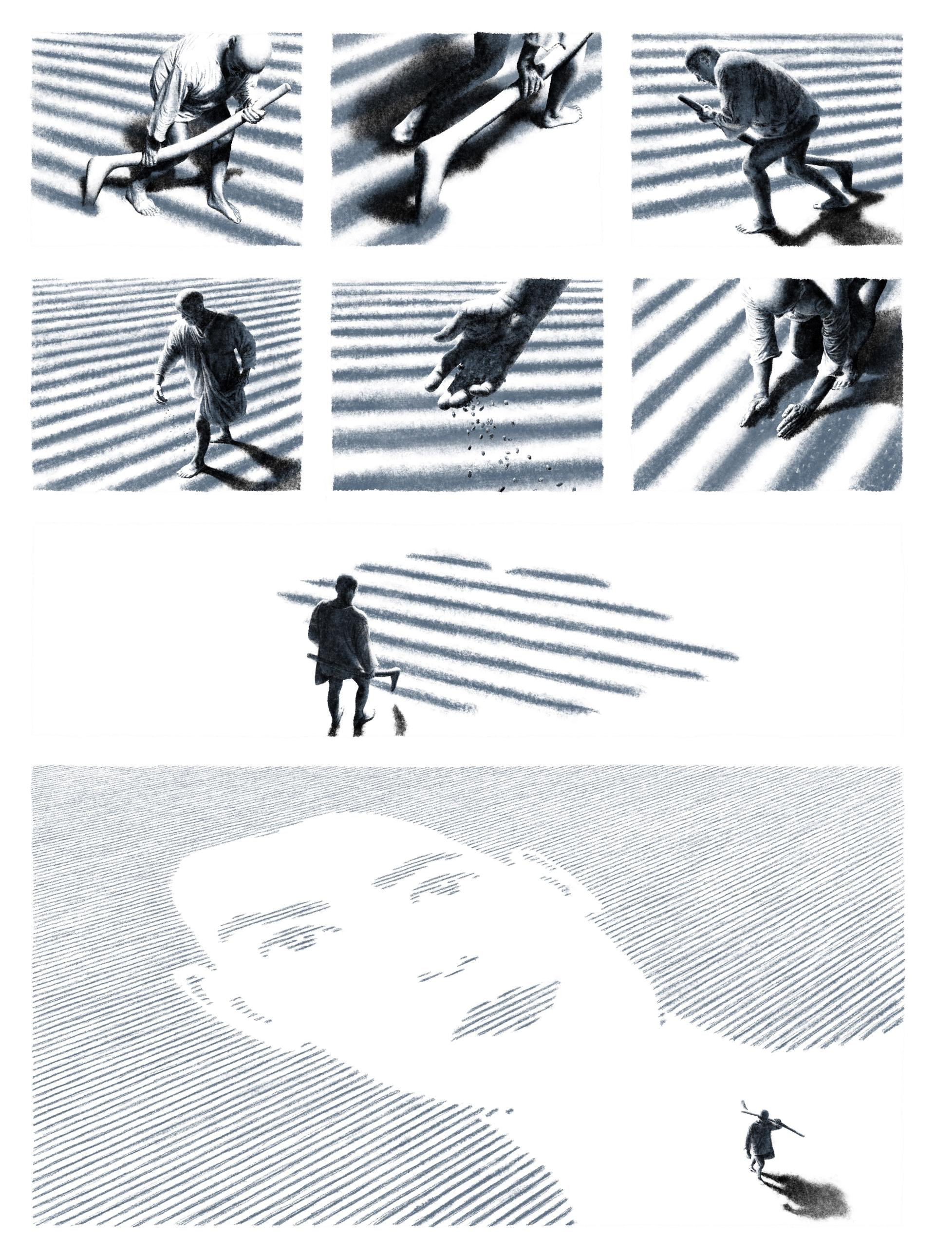 Vizualni je esej, dakle, započeo u tom tjeskobnom stanju, kakvo sugeriraju i nabrojane slike, sjećamo se svi, to su trenuci straha, neizvjesnosti, samoće. Sve je crno, bijelo, sivo, nema boje, i sve se odvija u tišini, nema onih stripovskih oblačića iznad njihovih glava, ništa ne izgovaraju.