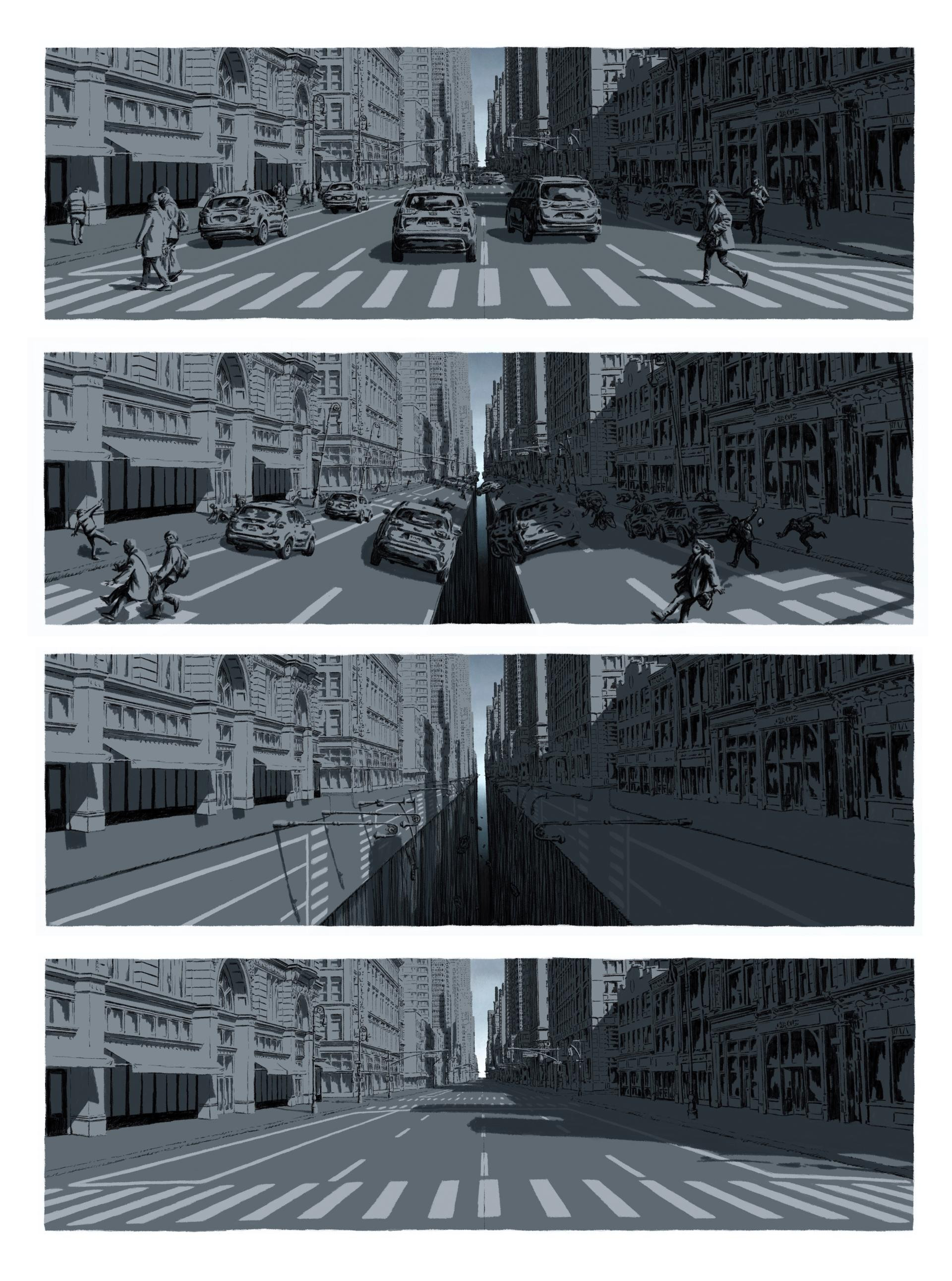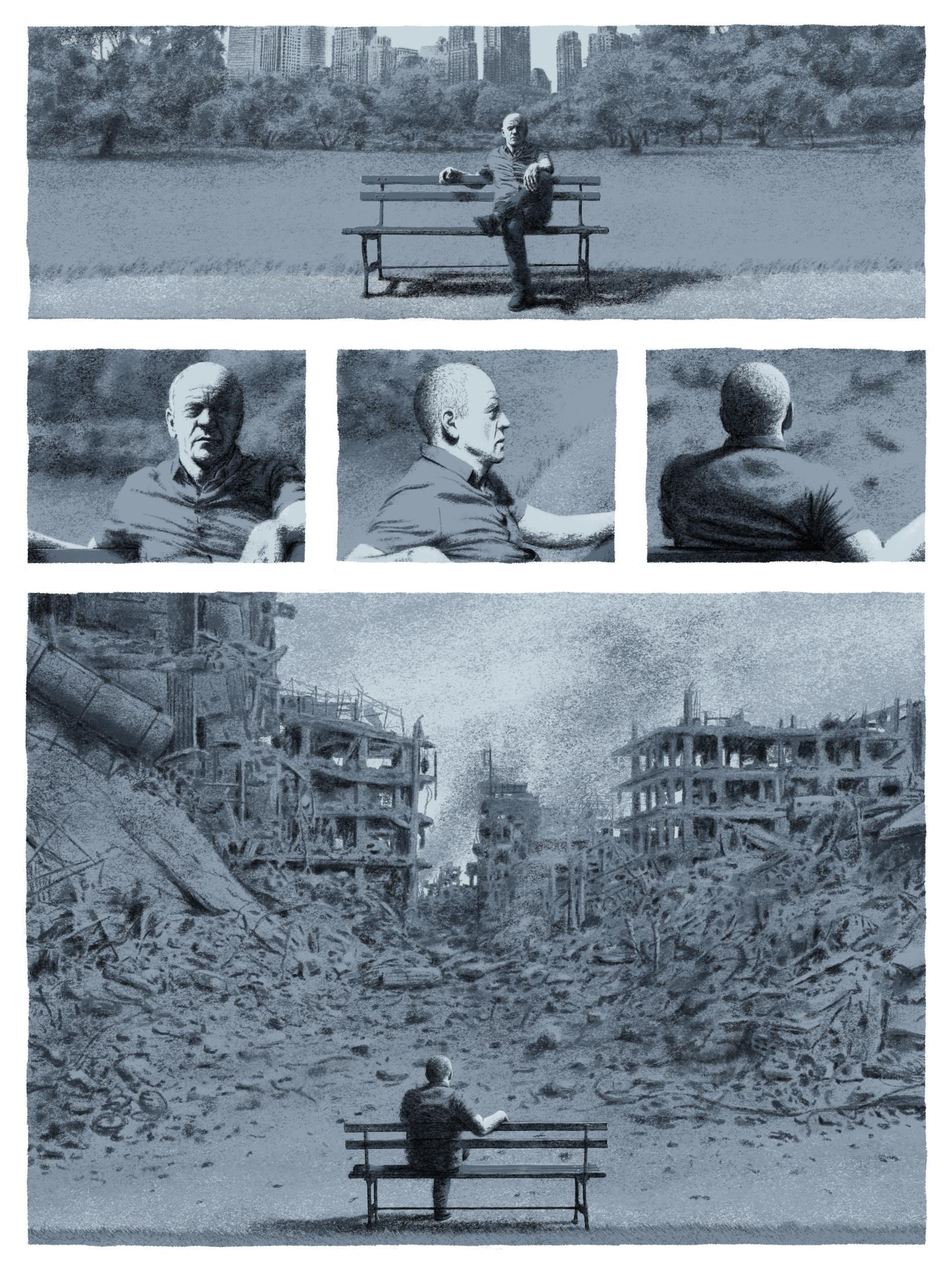 Na tablama vidimo i umjetnika, recimo kako sjedi pred apokaliptičnim ruševinama, na klupi koja je ostala netaknuta, s leđa, dok ga od naprijed gledamo tako da su park i visoke građevine njemu iza leđa. Zanimljive su i table u kojima vizualno prikazuje što se događa: tipično živu njujoršku ulicu, koja se urušava, i ostaje prazna ulica kakva je bila za korone, sve se odvija pred našim očima u tom stripu. Pratila sam na društvenim mrežama, djelomično, što je Ilić objavljivao, dosta se toga oslanja i na te fotografije koje je znao staviti, rekla bih.