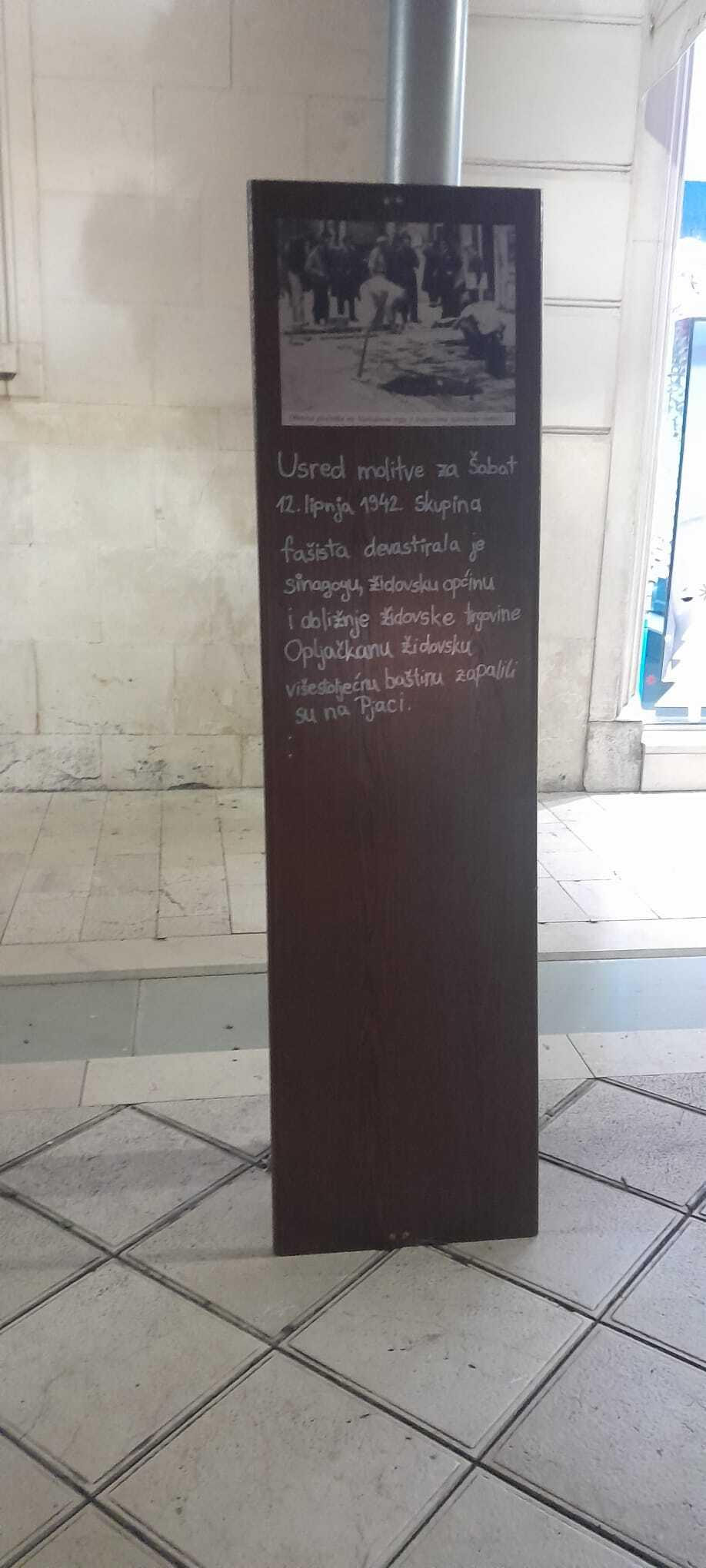 "Usred molitve za Šabat 12. lipnja 1942. skupina fašista devastirala je sinagogu, židovsku općinu i obližnje židovske trgovine. Opljačkanu židovsku višestoljetnu baštinu zapalili su na Pjaci".