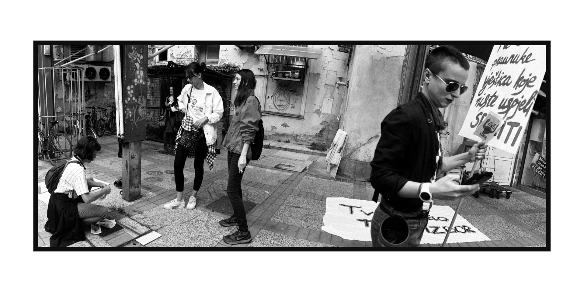 Osim priča o ženama u prostoru, ovo je priča i o javnom prostoru grada, neke od njezinih fotografija podsjetile su me na ono što je snimao, i još snima, Boris Cvjetanović u gradu. Primjerice, više govori, zapravo, o javnom prostoru fotografija Barbare Blasin na kojoj žena prelazi cestu koja više nalikuje na blatni put, uz nju je vidljiv i jedan Lunarov grafit, i dva prometna znaka, od kojih je jedan srušen, pao je na cestu, i nemam osjećaj, dok gledam ovaj prizor, da će ga itko uskoro popraviti. Nisam uspjela prepoznati u kojem je to dijelu Zagreba.