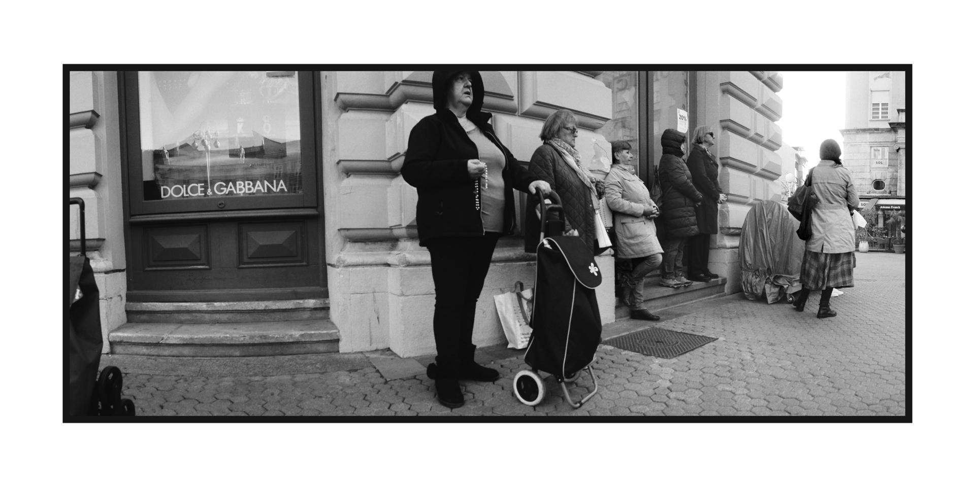 U svakom slučaju, riječ je o crno-bijelim fotografijama, i, rekla bih, socijalnima, u kojima ova autorica bilježi prije svega žene u javnom prostoru. One koje stoje uz izlog modne kuće koja reklamira jednu poznatu modnu marku na izlogu, i čekaju, one koje prolaze uz prugu (i na ovoj fotografiji, nažalost, Zagreb djeluje kao poprilično zapušten grad), pa ženu koja na buvljaku, pretpostavljam Hreliću, prodaje cipele. Mnogo je tih cipela, no u tom trenutku, kada se snima, nema baš kupaca oko nje. Snima potom ženu koja prodaje na placu, na Dolcu, na očito hladan zimski dan, oko nje nema baš drugih prodavača... Zbog ovih fotografija, dakle, tvrdim da je naglasak na socijalnoj fotografiji. Prikazuju se ponajviše, ne i nužno, socijalne teme.