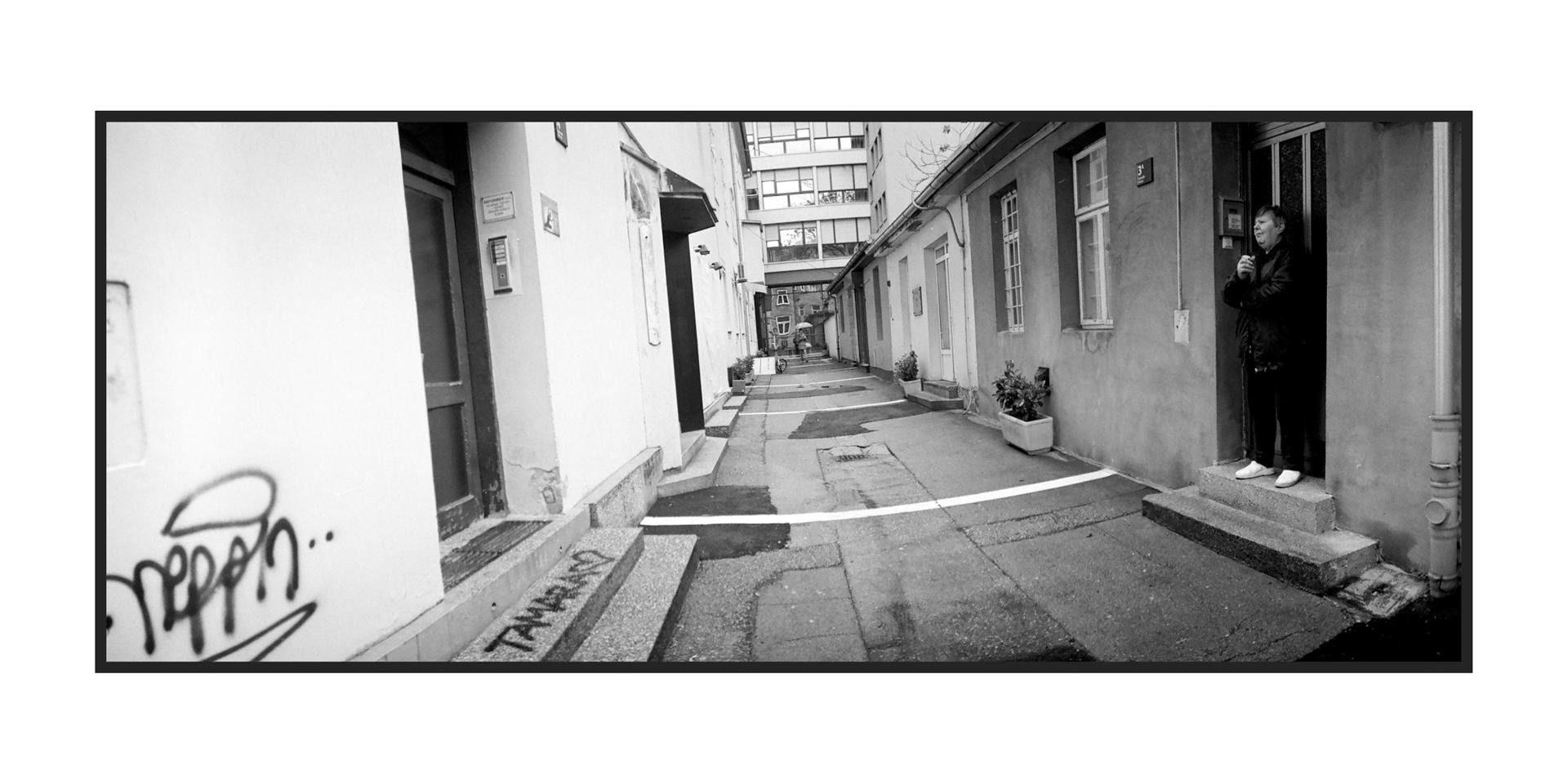 Ne znam kako snima, nije opisano uz izložbu, izlazi li s tom namjerom, ili baš uvijek ima fotoaparat uz sebe, no bilo mi je zanimljivo pročitati u tekstu Janke Vukmir uz izložbu da se služi starom analognom kamerom Horizont (ovdje sam se pak, nakon Cvjetanovića, sjetila Ivana Posavca) s polupanoramskim širokokutnim objektivom od 120 stupnjeva. Dakle, ne koristi se brzom digitalnom opremom, što se, naravno, na fotografijama i vidi. Takvom tehnikom radi nešto sporije, no dobiva željeno, a sama će dizajnerica i fotografkinja reći da takva zakrivljenost daje dodatnu dinamiku prizoru.