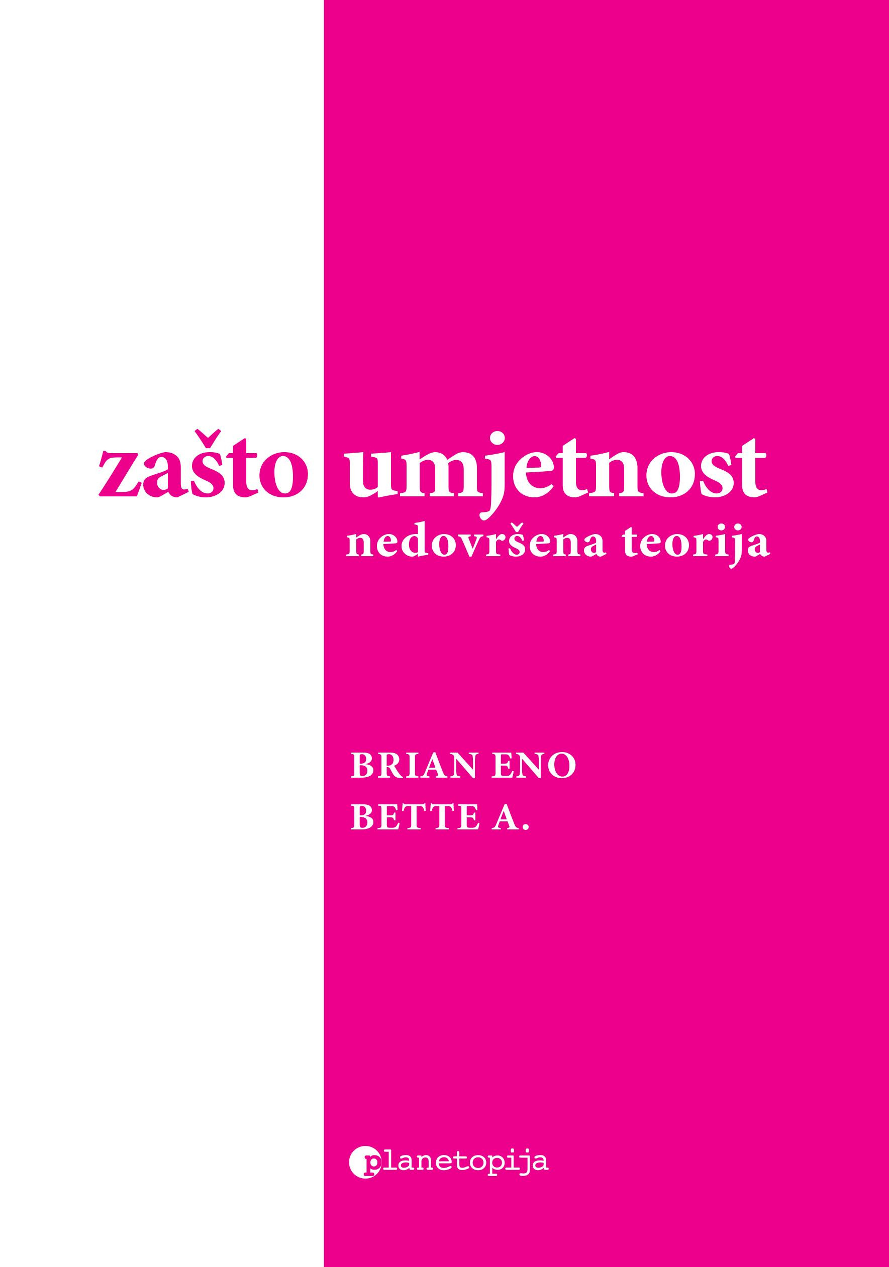 Možemo reći da je umjetnost jedna od glavnih odrednica bivanja čovjekom, kao što je to i jezik. Jasno nam je zašto je jezik univerzalno svojstvo, ali nemamo jasnu sliku zašto isto vrijedi i za umjetnost – to je pitanje ponukalo legendarnog umjetnika Briana Enoa i nizozemsku umjetnicu Bette Adriaanse da stvore ilustriranu knjigu koja istražuje značenje i svrhu umjetnosti. Ovo je prva knjiga Briana Enoa nakon 29 godina i na hrvatskom jeziku stiže u izdanju Planetopije. Zašto nam je umjetnost potrebna? Kako umjetnost zapravo funkcionira? Zašto se bavimo aktivnostima koje nazivamo umjetnošću?