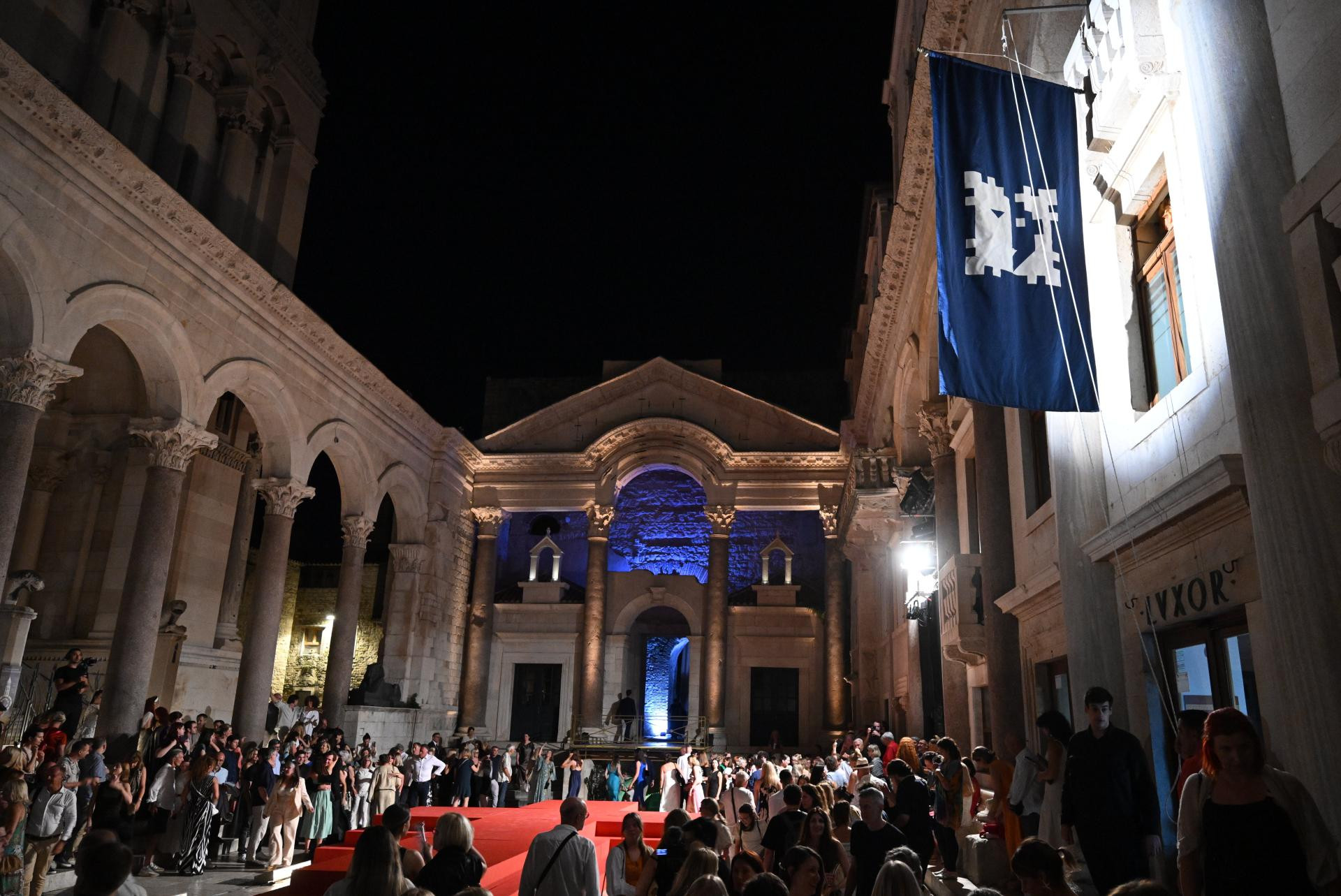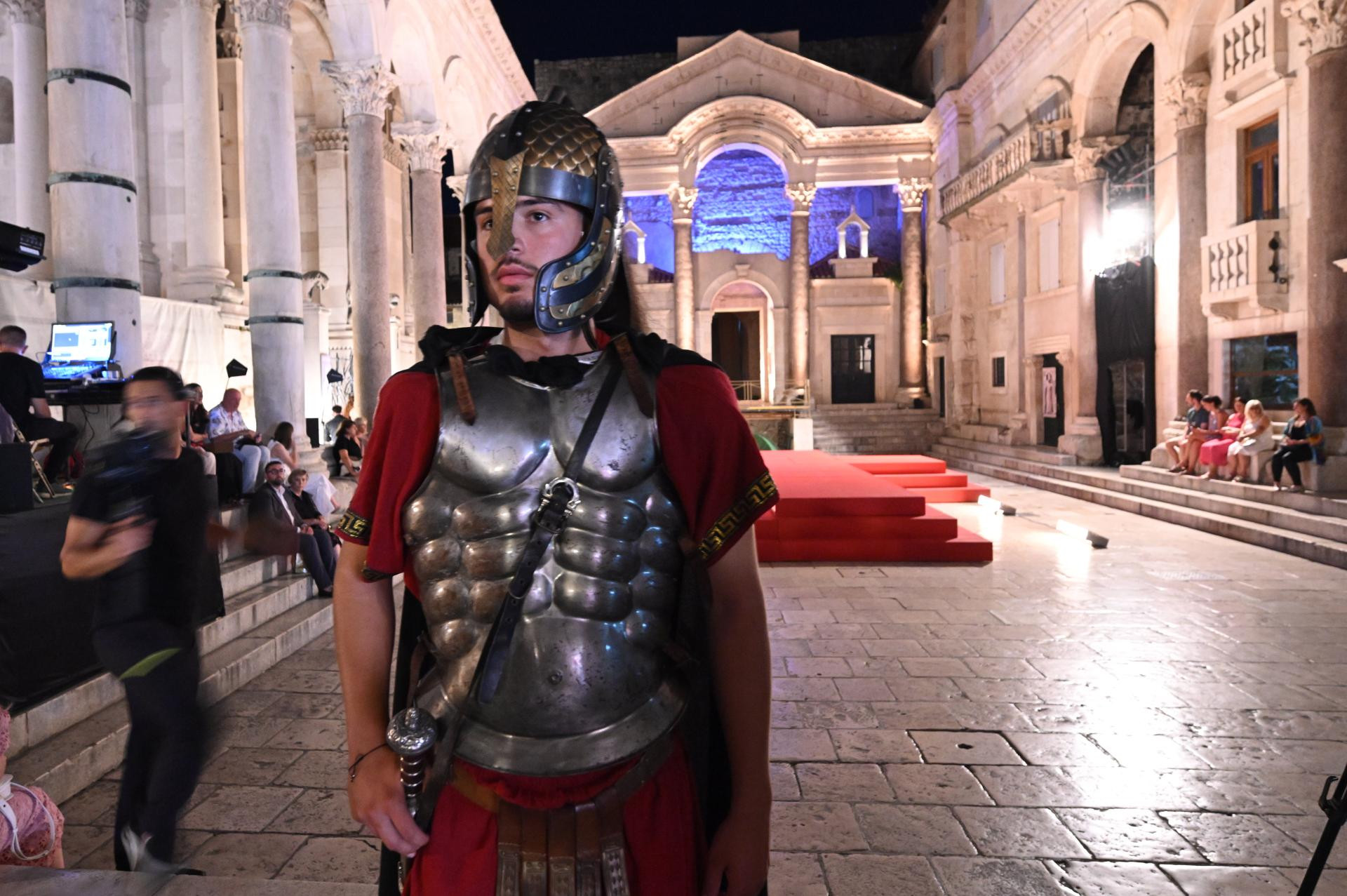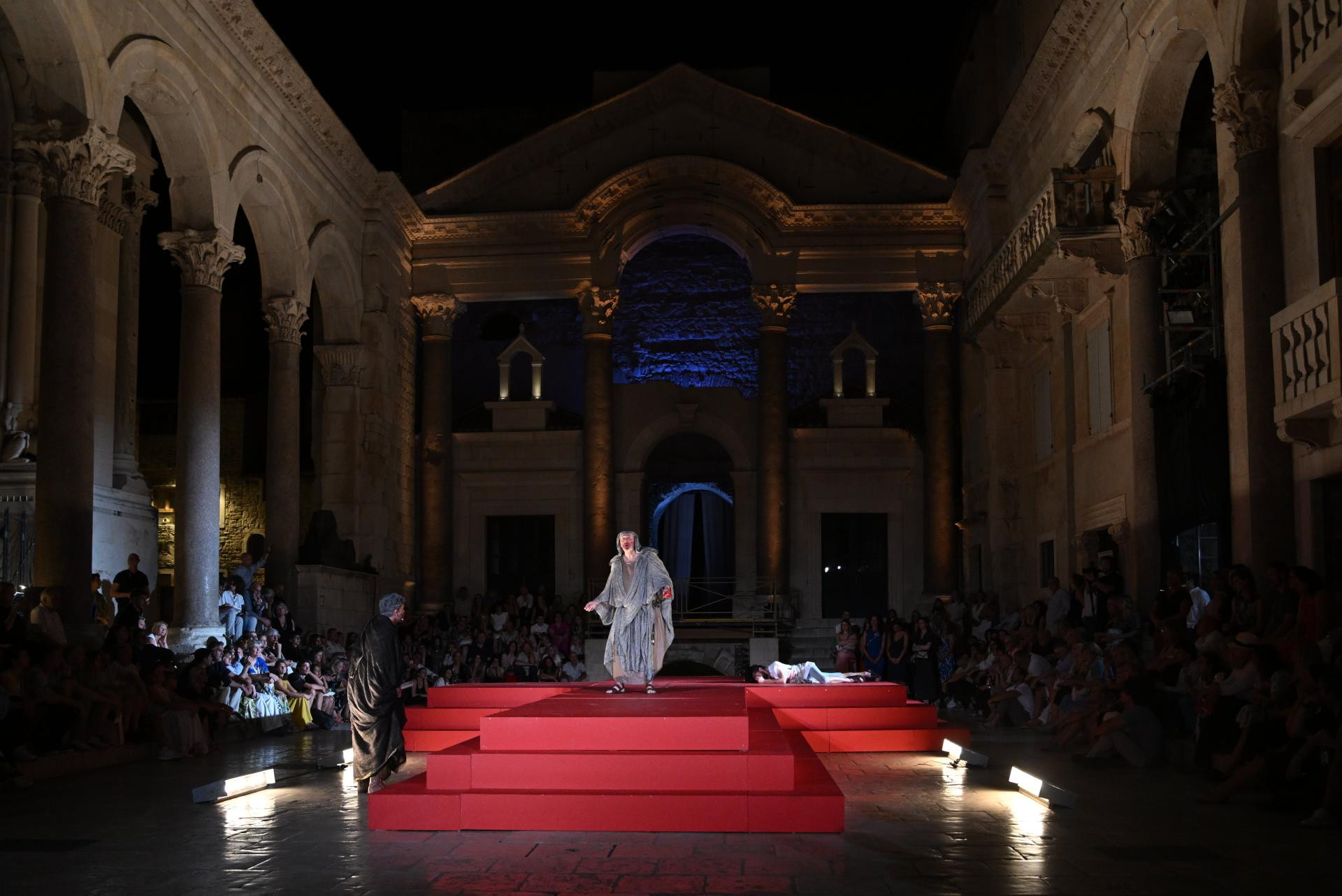 Glavni trenutak u redateljskoj koncepciji jest promjena scene u posljednjem prizoru: nakon što su tri čina i osam slika pogledali unutar kazališne zgrade, publika i kompletni izvođački korpus, koji zajedno sa zborom, orkestrom i baletom broj više od 300 duša uz dvadesetak članova autorskog tima, upućeno je na amblematsku opernu pozornicu festivala - Peristil. Deseci statista odjevenih u rimske legionare, u kostimima u kakvima ih obično svakodnevno viđamo po Peristilu kako se fotografiraju s turistima, pratilo je povorku koja se kretala od kazališnog ulaza, preko dijela Marmontove ulice, sve do mitskog kipa Sv. Grgura, kroz Zlatna vrata sve do Peristila. Bilo je u tome nešto ritualno, sveto, zamišljeno, uronjeno u taj antički kamen koji već stoljećima priča priču o dalmatinskom caru koji je rođen u obližnjoj Saloni (današnji Solin), vojnim uspjesima i urotama došao do mjesta imperatora, koji je s tog istog mjesta prvi u povijesti Rimskoga carstva vlastitom voljom odstupio i u mirovini se povukao u palaču koju je dao izgraditi u zaljevu u blizini rodnog grada, za stare dane, na temelju koje će kasnije izrasti Split.