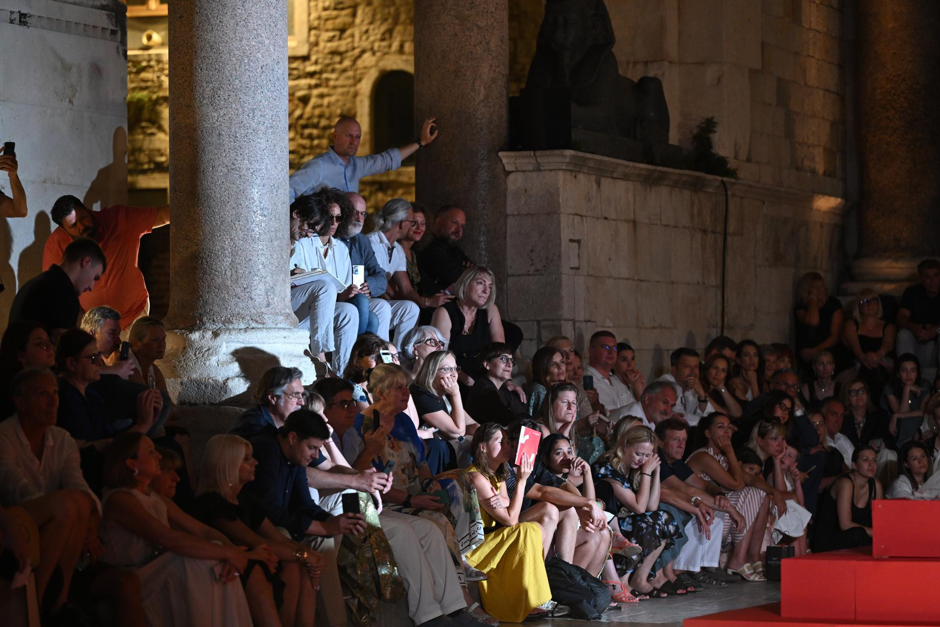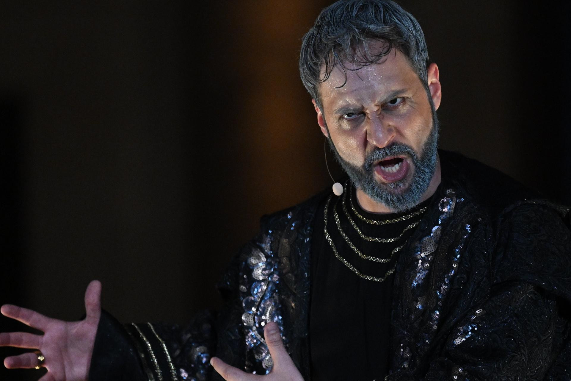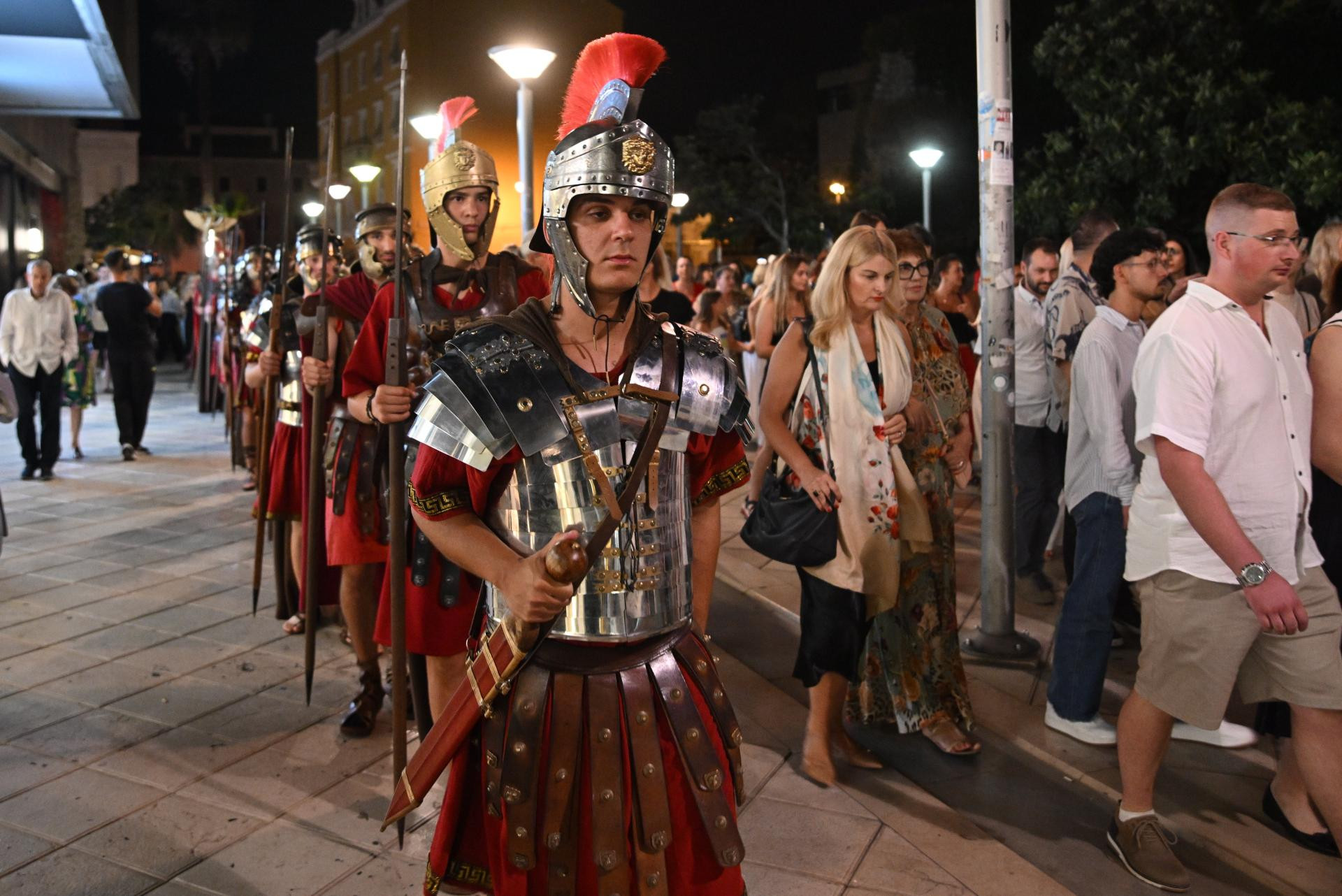 Glavni trenutak u redateljskoj koncepciji jest promjena scene u posljednjem prizoru: nakon što su tri čina i osam slika pogledali unutar kazališne zgrade, publika i kompletni izvođački korpus, koji zajedno sa zborom, orkestrom i baletom broj više od 300 duša uz dvadesetak članova autorskog tima, upućeno je na amblematsku opernu pozornicu festivala - Peristil. Deseci statista odjevenih u rimske legionare, u kostimima u kakvima ih obično svakodnevno viđamo po Peristilu kako se fotografiraju s turistima, pratilo je povorku koja se kretala od kazališnog ulaza, preko dijela Marmontove ulice, sve do mitskog kipa Sv. Grgura, kroz Zlatna vrata sve do Peristila. Bilo je u tome nešto ritualno, sveto, zamišljeno, uronjeno u taj antički kamen koji već stoljećima priča priču o dalmatinskom caru koji je rođen u obližnjoj Saloni (današnji Solin), vojnim uspjesima i urotama došao do mjesta imperatora, koji je s tog istog mjesta prvi u povijesti Rimskoga carstva vlastitom voljom odstupio i u mirovini se povukao u palaču koju je dao izgraditi u zaljevu u blizini rodnog grada, za stare dane, na temelju koje će kasnije izrasti Split.