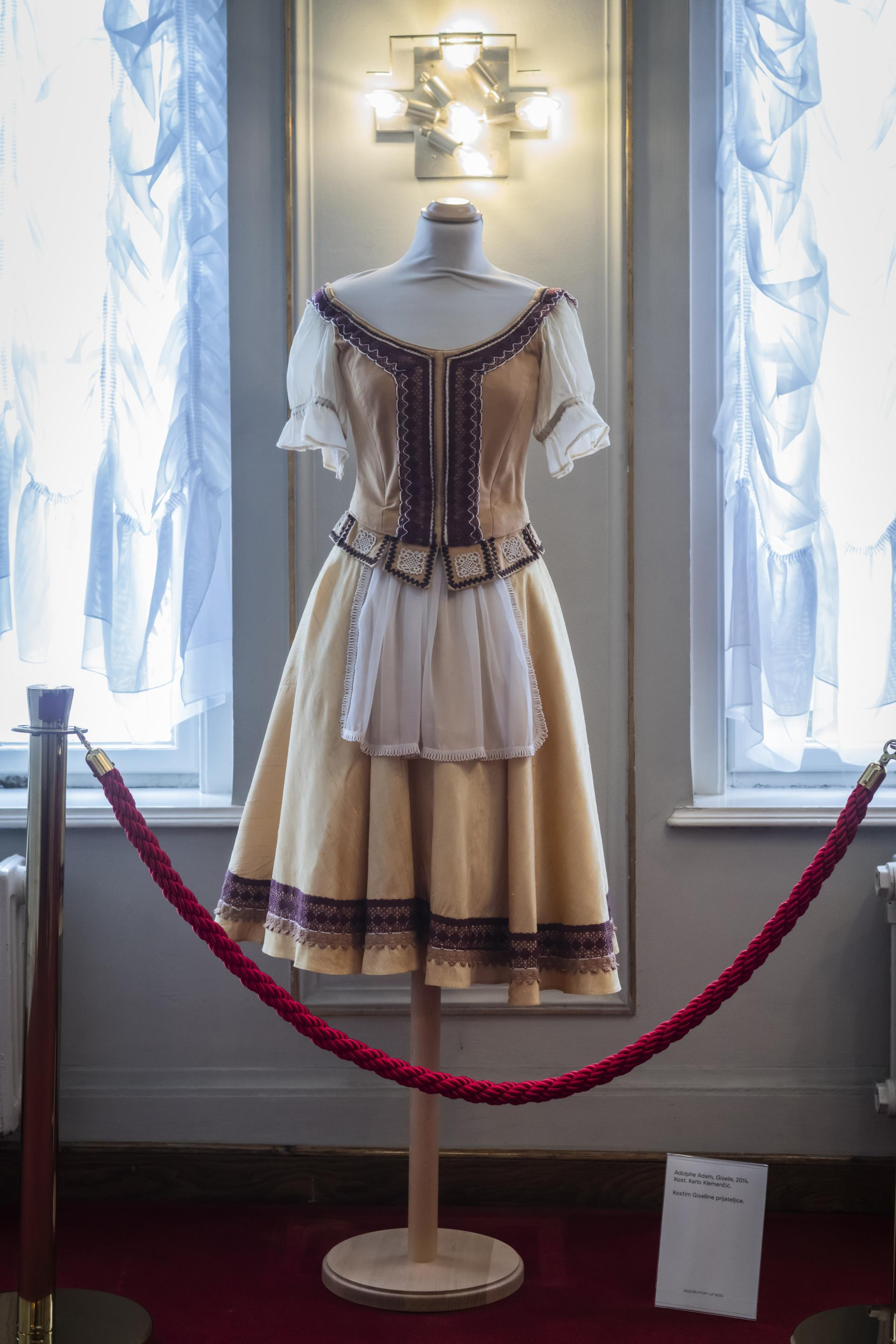 Među izloženim kostimima pažnju plijeni, jasno, jedan od onih s groblja. Takav na sebi imaju balerine koje plešu uloge vila, odnosno, zaručnica koje su umrle prije svojeg vjenčanja, i prepoznatljiv je po tome što ima ušivena malena krila na dnu leđa. Tu su i kostimi Giselle iz prvog čina, kada je ona još vesela seoska djevojka, te, recimo, onaj kojeg na sebi ima njen nevjerniAlbrecht. Na panoima, osim prekrasnih balerina koje su u Zagrebu plesale naslovnu ulogu, pažnju privlači kazališna cedulja, kako se to tada zvalo, za prvu izvedbu baleta koji se onomad zvao Gizela. Bilo je to 1897. godine i simpatična je napomena na dnu te cedulje vezana za cijenu: stoji kako je ona jednaka kao i za - operne naslove.