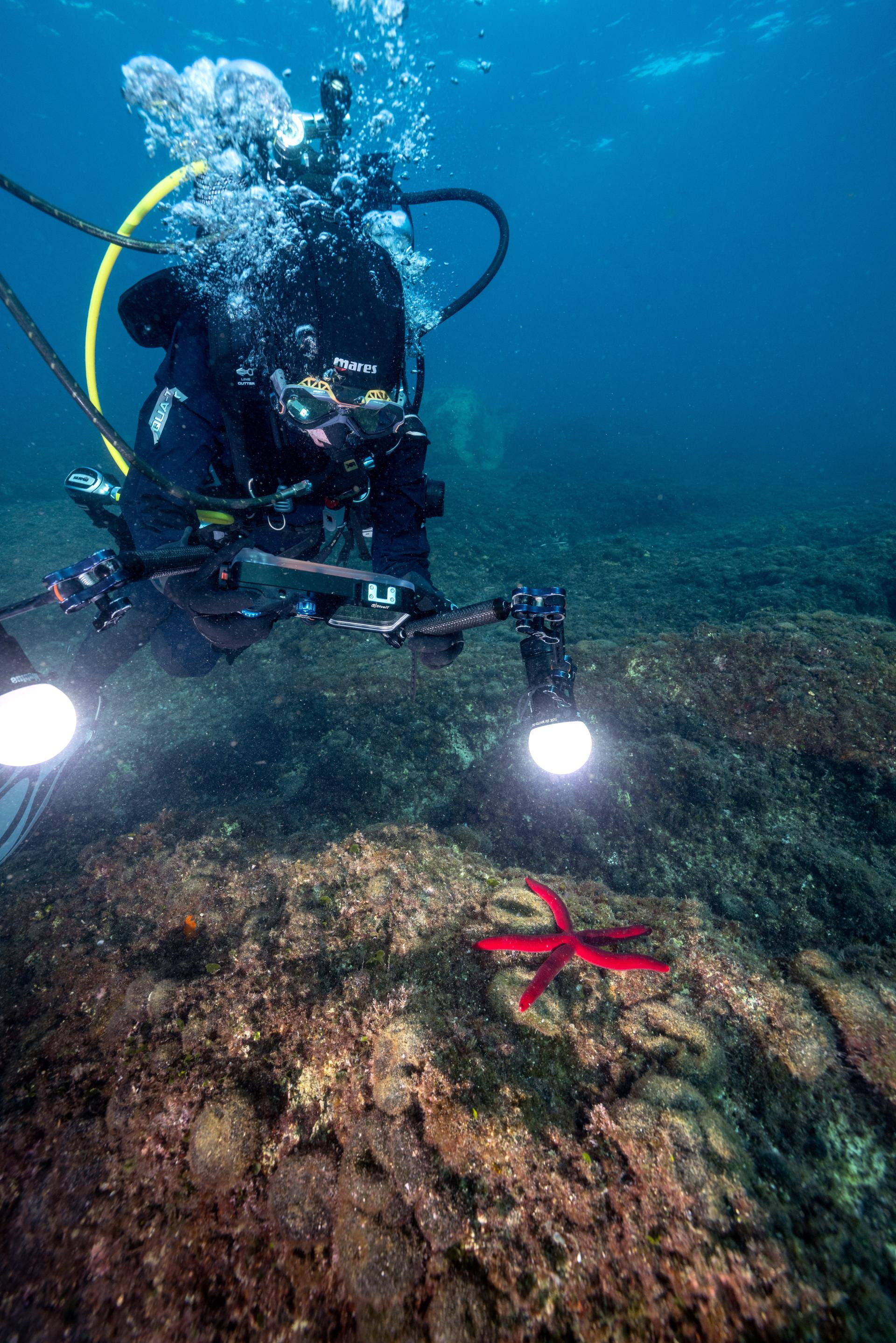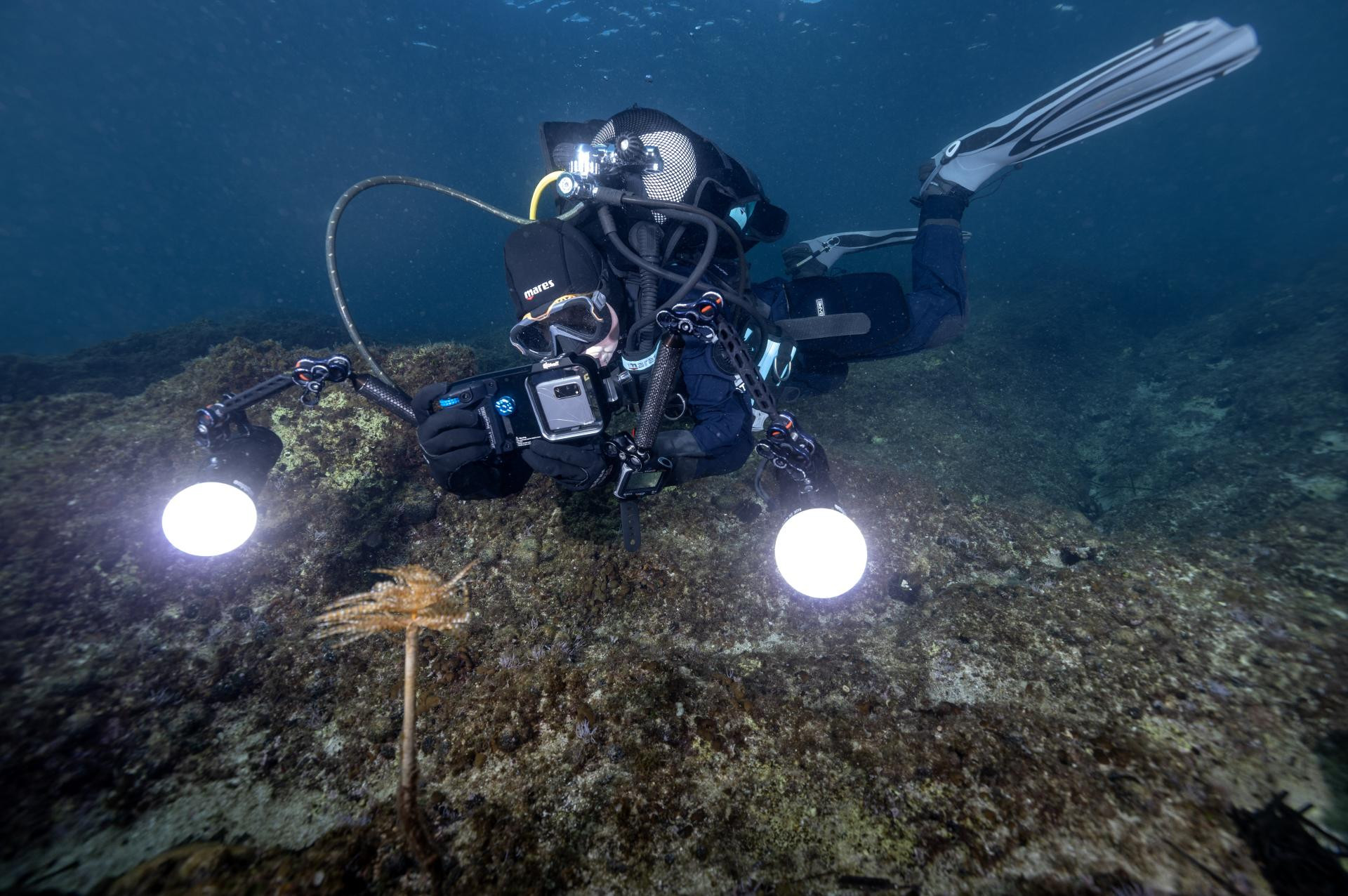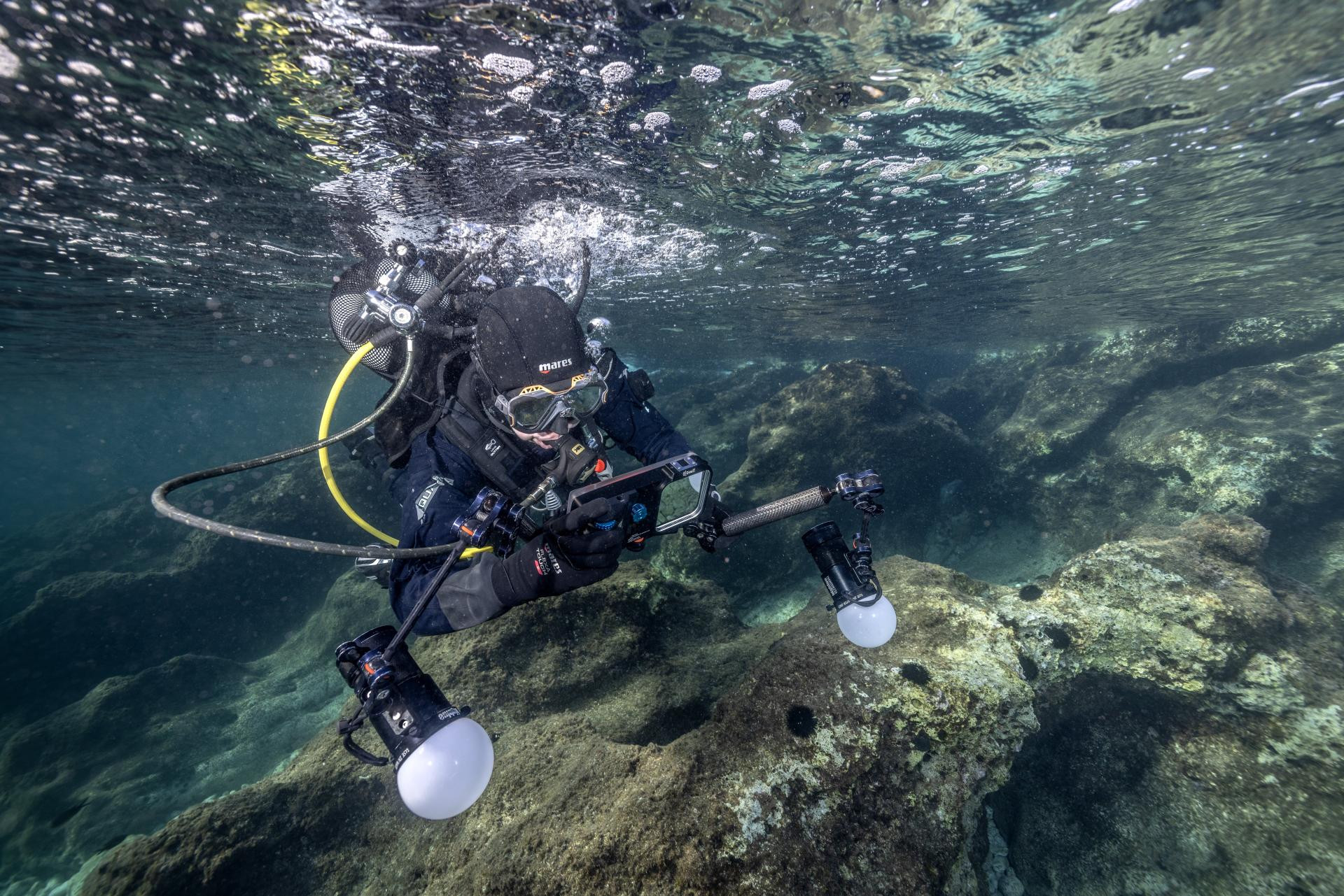 Kamenita se obala sličnim reljefom nastavlja i u podmorje, a formacije stijena u plićini su vrlo zanimljive za „driftanje“ u laganoj morskoj struji. Kako nama - tako i brojnim jatima manjih vrsta riba koja su kružila oko nas. Iako Weefine garantira za svoje kućište sigurno podnošenje čak osamdeset metara dubine, nama to ipak nije bilo potrebno, a s našim ronilačkim brevetima niti dozvoljeno. Htjeli smo se samo uvjeriti iz prve ruke kako funkcionira aplikacija za fotografiranje, u kombinaciji s video rasvjetom koju smo dodali pomičnim „rukama“ na kućište. Postavili smo dubinsku granicu testnog urona na nekih petnaestak metara.