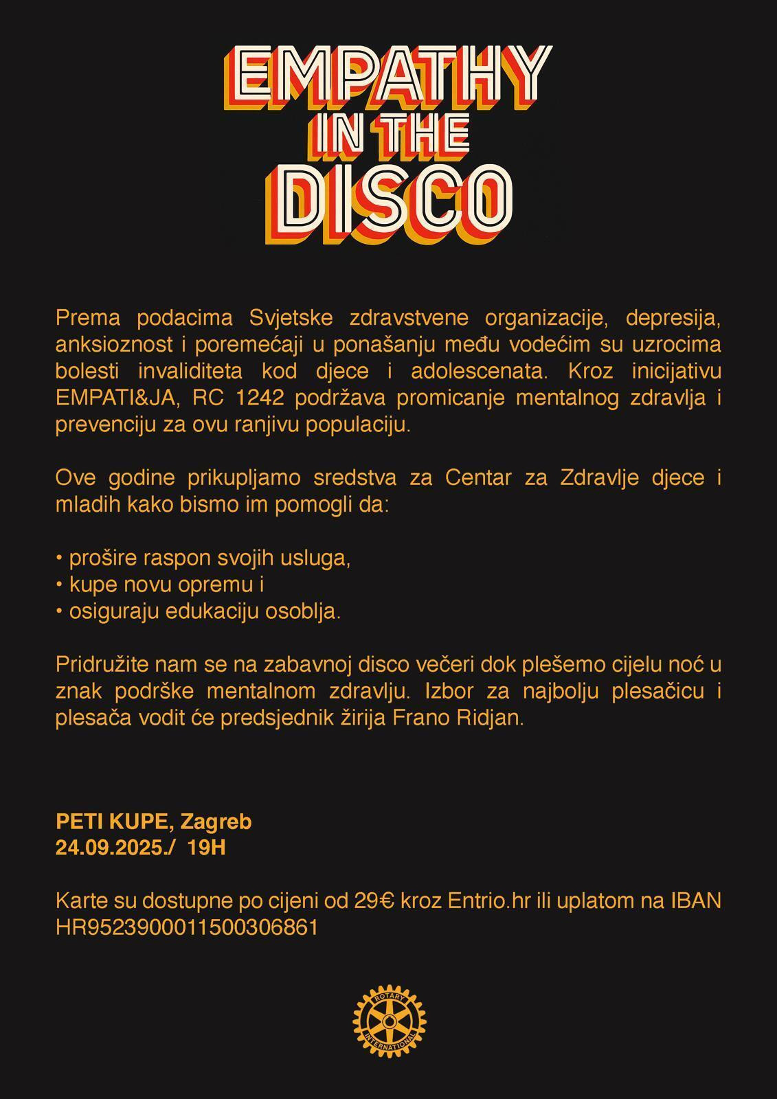 Prema podacima Svjetske zdravstvene organizacije, depresija, anksioznost i poremećaji u ponašanju među vodećim su uzrocima bolesti i invaliditeta kod djece i adolescenata. Stoga briga o mentalnom zdravlju djece i mladih postaje sve važnija tema društva, a upravo s ciljem jačanja podrške najmlađima, 24. rujna Klub Rotary Club 1242 organizira humanitarni događaj „EMPATI&JA – Empathy in the Disco“.