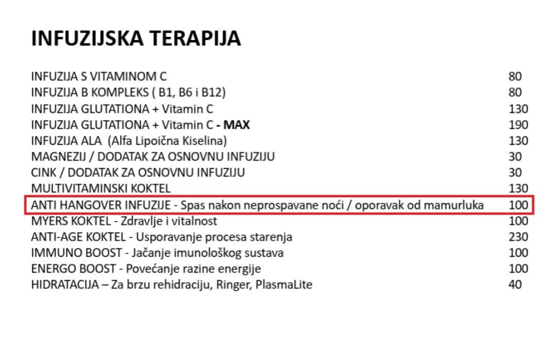 Zaključak: Ako vam liječnik nije propisao navedenu infuziju nakon detaljne provjere razine nutrijenata u krvi, velika je vjerojatnost da ona nije za vas. Nije preporučljivo otići u neku kliniku, primiti infuziju i zatim se jednostavno vratiti kući. U najboljem slučaju, to je bacanje novca.