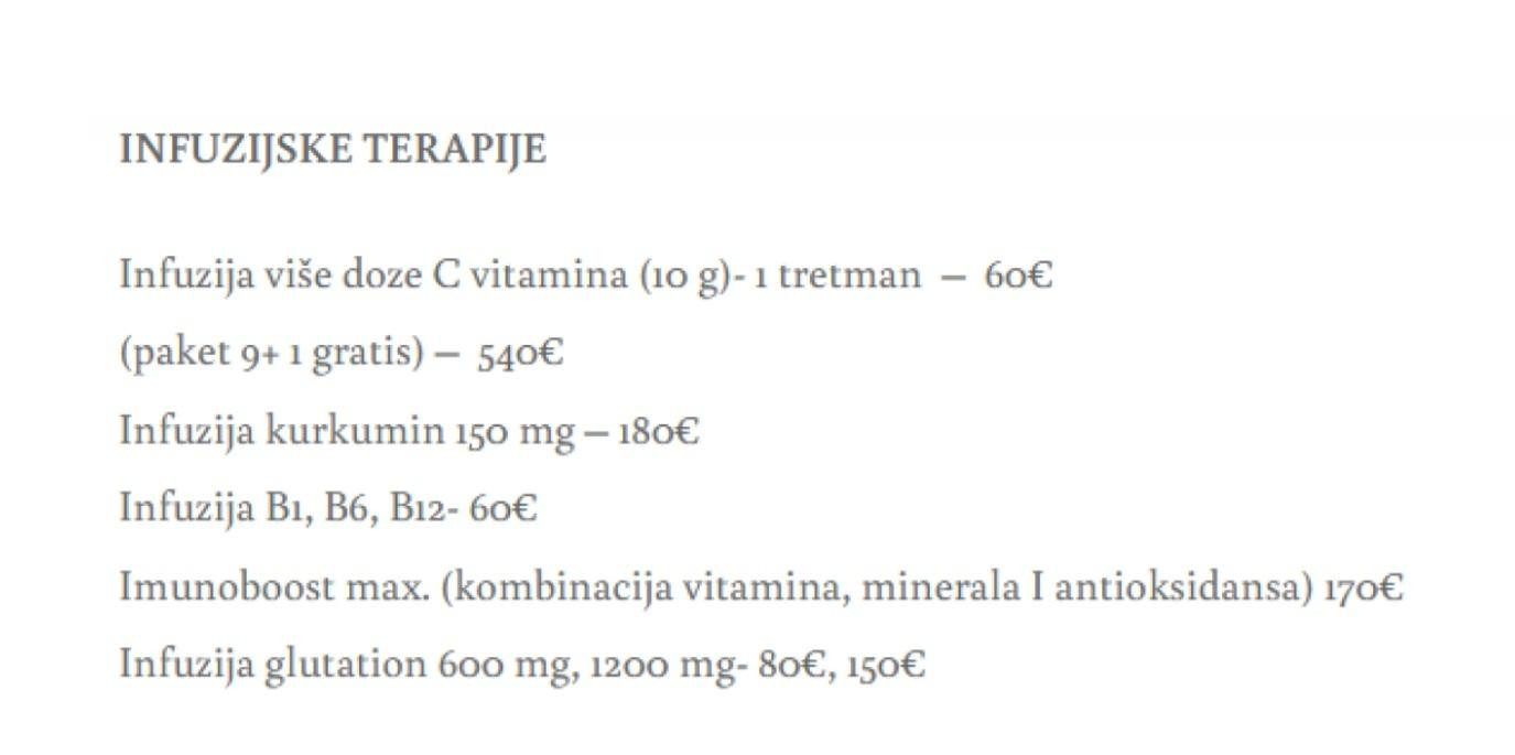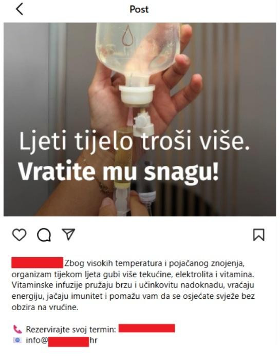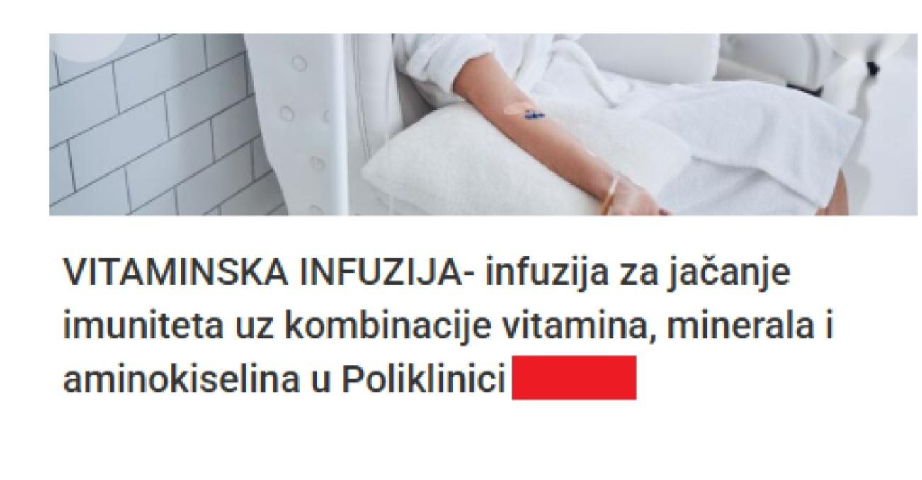 "Zbog visokih temperatura i pojačanog znojenja, organizam tijekom ljeta gubi više tekućine, elektrolita i vitamina. Vitaminske infuzije pružaju brzu i učinkovitu nadoknadu, vraćaju energiju, jačaju imunitet i pomažu vam da se osjećate svježe bez obzira na vrućine", stoji u oglasu jedne poliklinike koja nudi spomenute infuzije zdravim ljudima.