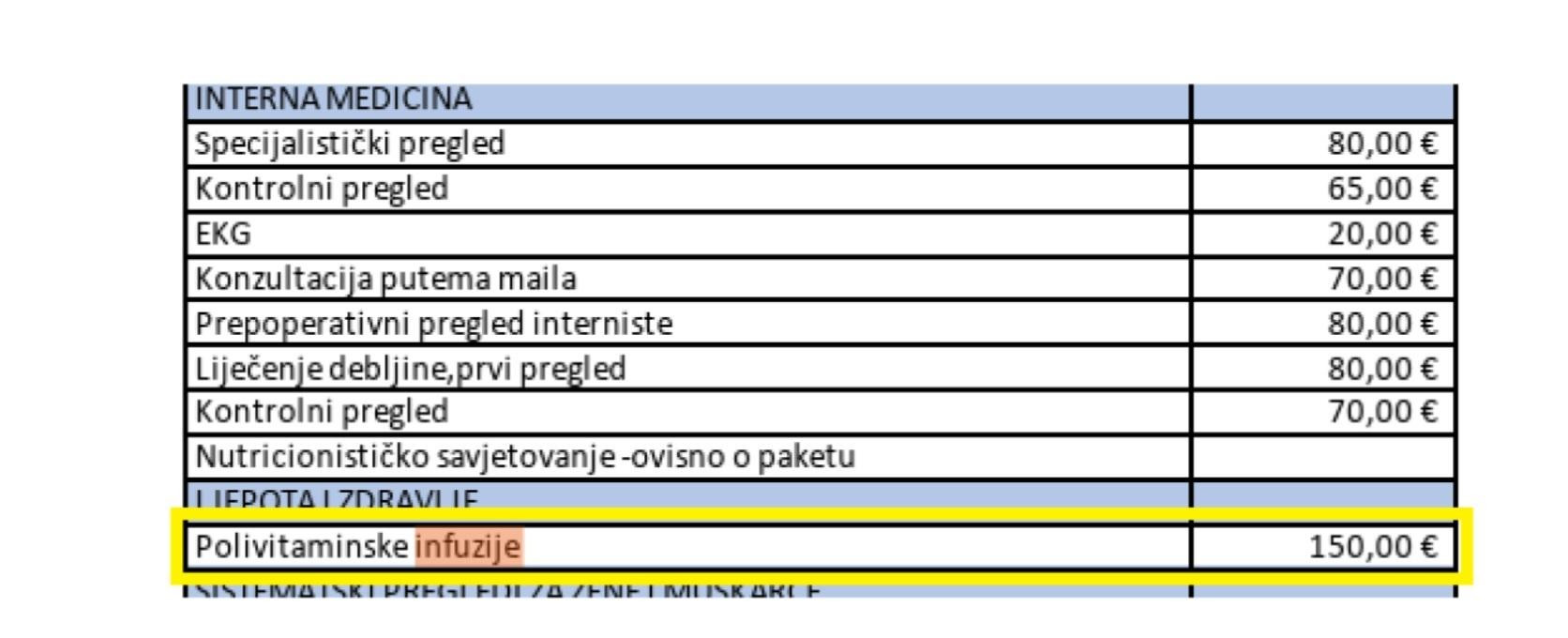 - Ako netko ima takve zahtjeve i jasnu indikaciju, onda će tu infuziju dobiti u bolnici, smiješno mi je da je taj trend došao i kod nas. Kod zdravih ljudi koji imaju funkcionalna usta i probavu, nema potrebe za infizujama. Ako vam je vruće i iscrpljeni ste, napijte se vode ili pojedite voćku, odmorite se i tijelo će vam regulirati problem. Osim ako nemate viška novca za nepotrebno bockanje i moguće probleme - objašnjava taj liječnik koji je Slobodnoj Dalmaciji poslao i cjenike iz nekoliko klinika, neke od njih slove kao renomirane.