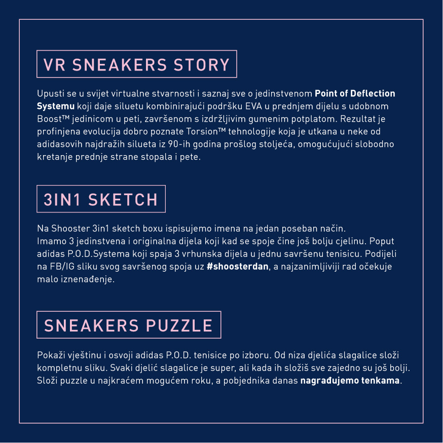 Ljeto nam je na izmaku, a Shooster je pun energije i poziva te na druženje! Shooster Dan ove subote u Arena Centar donosi gomilu vrhunske zabave. Pripremili smo aktivnosti za sve posjetitelje, a najbolje i nagrađujemo sjajnim P.O.D.System tenisicama. Izazvati ćemo vas da pokažete vještinu slaganja puzzli, ispisivati i crtati ćemo personalizirane radove, pokazati vam kako je nastala P.O.D. tenisca u virtualnoj stvarnosti i još mnogo toga... Zabava za sve koji dođu do Shooster zone u Arena Centru!
