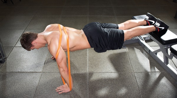 Stavite elastičnu gumu preko gornjeg dijela leđa tako da ručke budu pod dlanovima. Iz ovog položaja radite klasične sklekove. Kada se dižete, guma se zateže i dodaje otpor koji postaje najveći kad su svi zglobovi u ekstenziji. Suprotno tome, na putu prema dolje, elastična guma je sve manje zategnuta i pruža sve manje otpora.