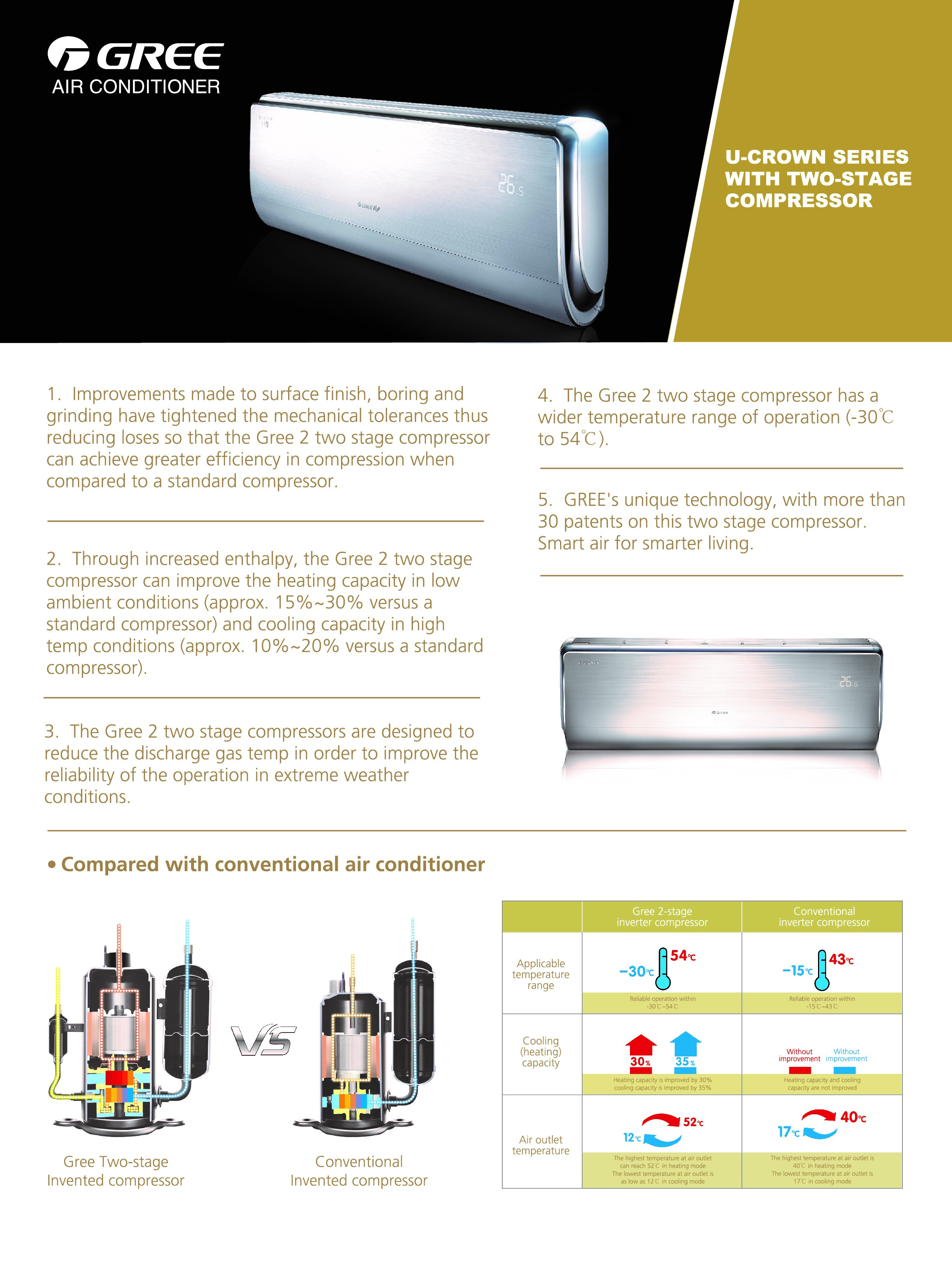 U-Crown klima uređaj na tržištu se od svojih konkuranata izdvaja jer prvi na svijetu koristi tehnologiju dvostupanjskog kompresora koja mu omogućava grijanje i zadržavanje nominalnog kapaciteta na ekstremno niskim temperaturama na kojima drugi uređaji ne rade. U-Crown klima uređaj pri vanjskoj temperaturi od -15°C zadržava puni nominalni kapacitet grijanja, a njegov rad je zajamčen i na -30°C i to sa veoma visokim kapacitetom à 80% nominalnog kapaciteta grijanja.