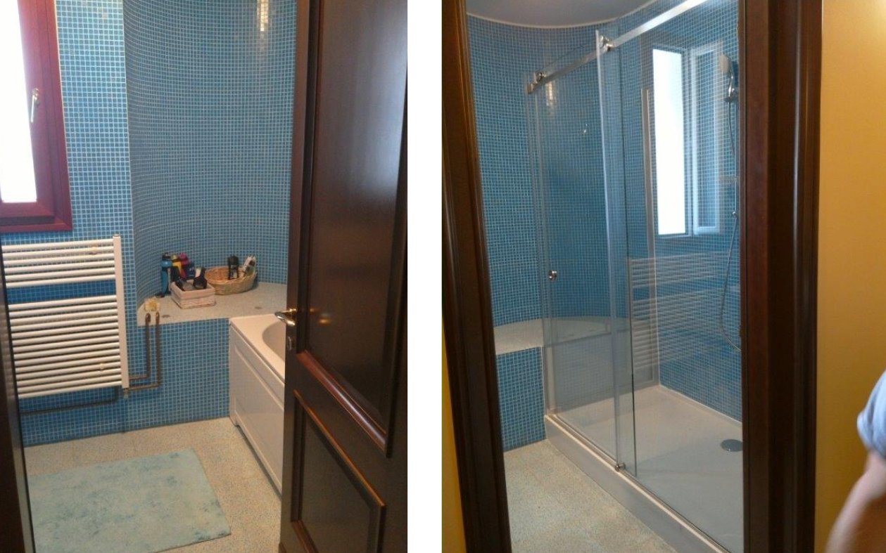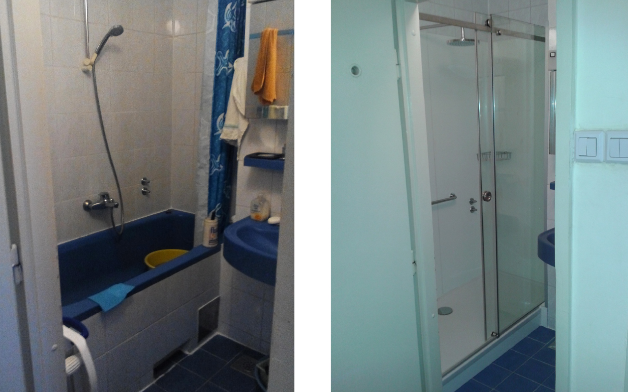 Usluga prenamjene u tuš prostor podrazumijeva demontažu i odvoz postojeće ležeće kade i šute, montažu niske tuš kade na unaprijed pripremljeno postolje, opločenje zidova posebnim pločama i stvaranje novog tuš prostora, montažu električnog bojlera, montažu zaštite od špricanja vode u izvedbi štanga i zastor, fiksnu staklenu stijenu, staklenu stijenu sa kliznim vratima, sav pribor za montažu te puštanje u upotrebu.
