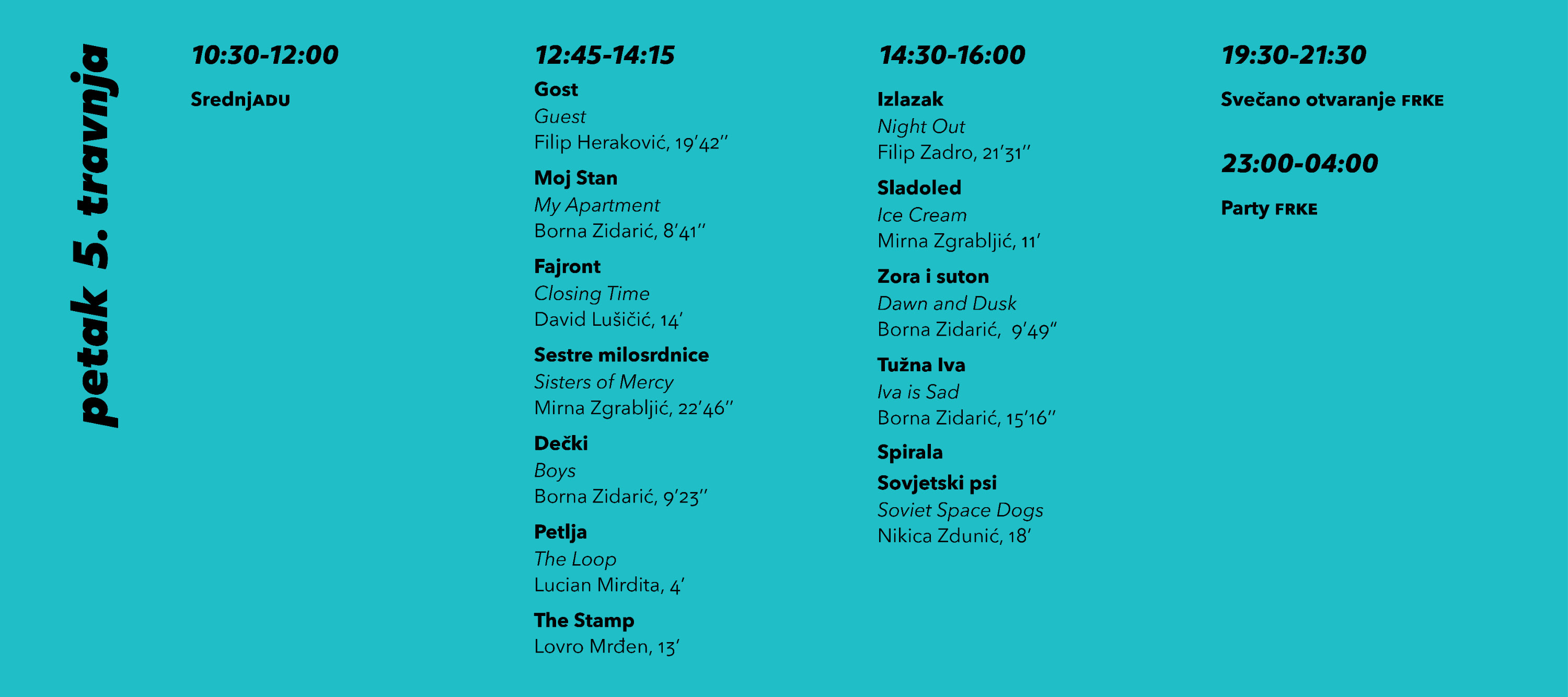 Na samom otvorenju FRKE nastupit će Zdenka Kovačiček, a revija ove godine ima bogat popratni program koji uključuje posjet studenata Sveučilišta DePaul iz Chicaga i predstavljanje njihova. Posjetitelji će imati priliku postati dijelom kultnih filmskih scena pozirajući u foto kiosku, a organizirane su i projekcije studentskih filmova ADU namijenjenih zagrebačkim srednjoškolcima.