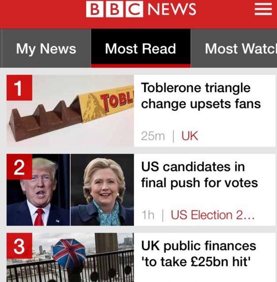 U kojoj mjeri je razmak između trokutića na čokoladi Toblerone potresla stanovnike Ujedinjenog Kraljevstva ponajbolje svjedoči čitanost na portalu uglednog BBC-a. A ondje je danas ta vijest najčitanija. Čitanija od vijesti o američkim izborima.
