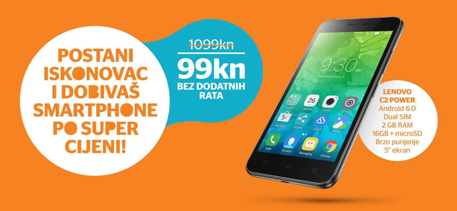 Uz uslugu interneta, televizije i(li) telefona, Iskonovi tisućaši u vremenski limitiranoj akciji sada imaju mogućnost odabrati i smartphone Lenovo C2 Power za samo 99 kuna.