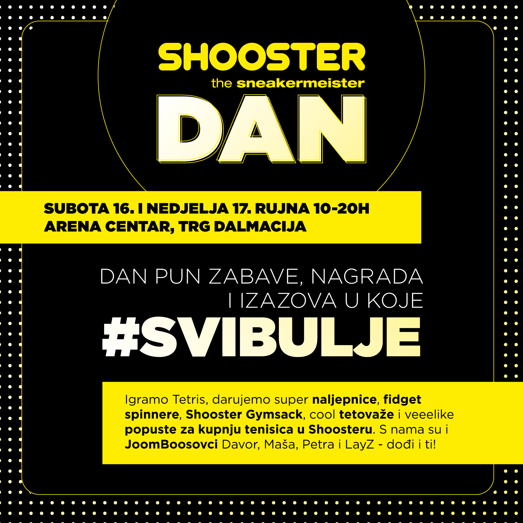Osim brojnih promocija, popusta, izazova, darivanja tenisica po izboru, Shooster dan nudi još toga. S nama će u subotu i nedjelju u terminima 11–14h i 16–19h biti ekipa iz JoomBoosa - Davor, Maša, Petra i LayZ - koji pripremaju lude izazove, autogram kartice, super nagrade i popuste do čak 50%.