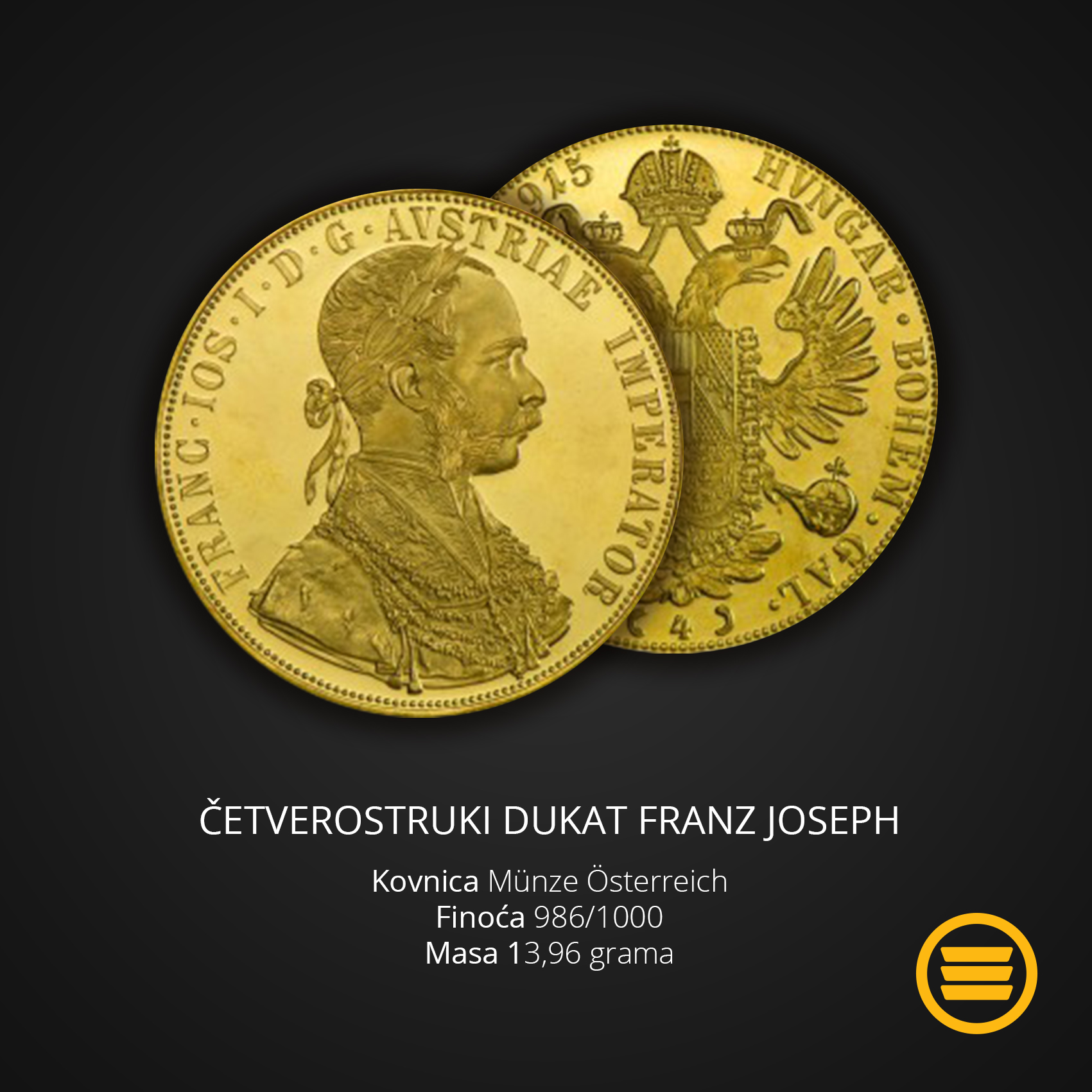 Najpopularniji dukat dobio je ime po austrijskom (i hrvatskom) caru Franji Josipu. Prvi puta je otisnut 1915. godine, a upravo je taj i najprisutniji u našim krajevima. Koristio se kao vjenčani dar, ukras, investicija za budućnost, ali i kao moneta u međunarodnim plaćanjima, a i danas je vrlo tražen: upravo su dukati najprodavaniji artikli u ponudi investicijskog zlata Auro Domusa.