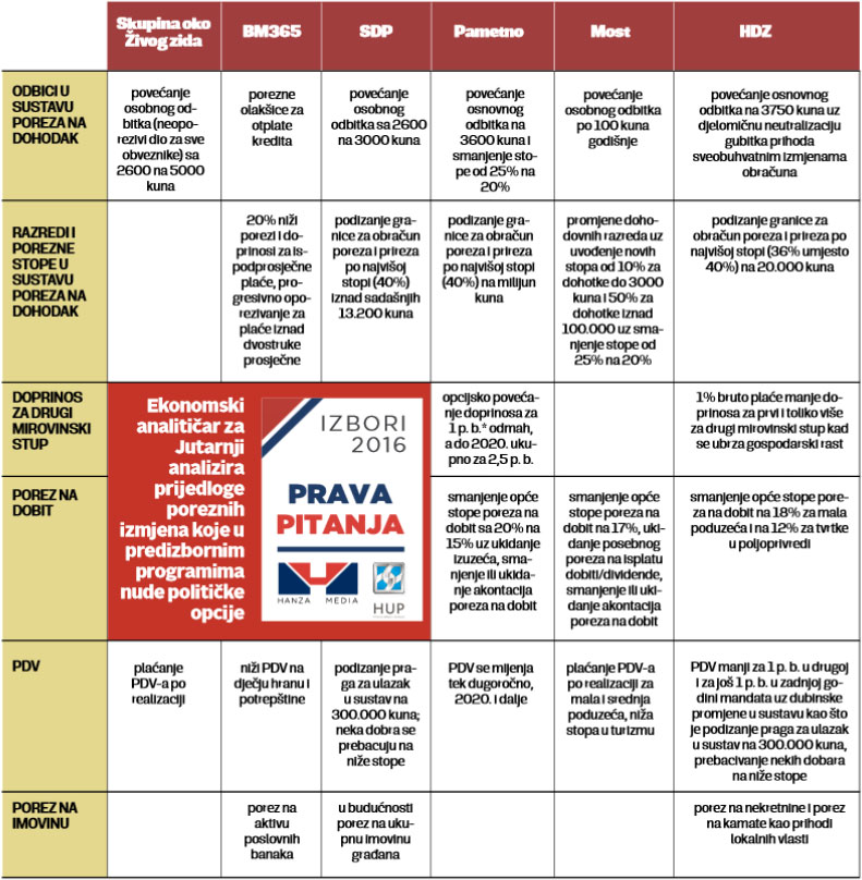 Ima razloga za zadovoljstvo prikazanim u dosadašnjem dijelu javne debate o porezima. Cjelovito smanjenje poreza koje predstavlja okosnicu gospodarskih programa nikome nije palo na pamet prije ovih izbora. Iako su mnogi detalji prijedloga ostali nedorađeni ili neotkriveni, birači sada mogu uočiti glavne razlike između HDZ-a i SDP-a u pogledu porezne politike. HDZ poreze napada na širokom frontu, obećavajući smanjenja gotovo svih poreznih oblika, što se dijelom kompenzira uvođenjem poreza na nekretnine. SDP odbija novi porez, ali suštinski ne dira u PDV i porez na dobit, nego se koncentrira na (oprezno) smanjenje poreza na dohodak. Uz to, stječe se dojam da su obje glavne političke opcije shvatile opasnost koju nosi previsoko porezno opterećenje od 40% na već srednje visoke plaće; slabljenje srednje klase, manje zapošljavanje stručnjaka i odustajanje velikih i IT tvrtki od zapošljavanja menadžera i eksperata u Hrvatskoj.