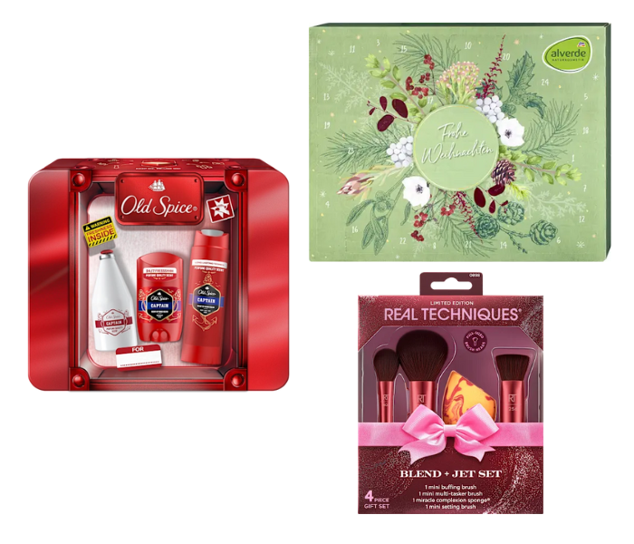 Real Techniques Poklon-paket Blend + Jet Set idealan je za ljubiteljice šminkanja, alverde Adventski kalendar Frohe Weihnachten obožavat će oni koji vole prirodnu kozmetiku, a Old Spice Poklon-paket Captain Tin Box savršen je poklon za muškarca jer dolazi u praktičnoj limenoj kutiji koja se može ponovno koristiti za čuvanje osobnih stvari.