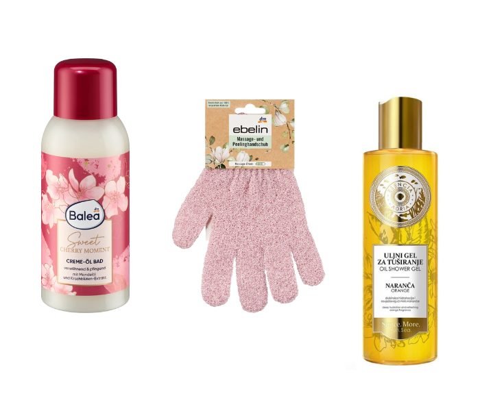 Balea kremasta uljna kupka s mirisom trešanja, Esencia Adria uljni gel za tuširanje, Ebelin rukavica za piling i masažu