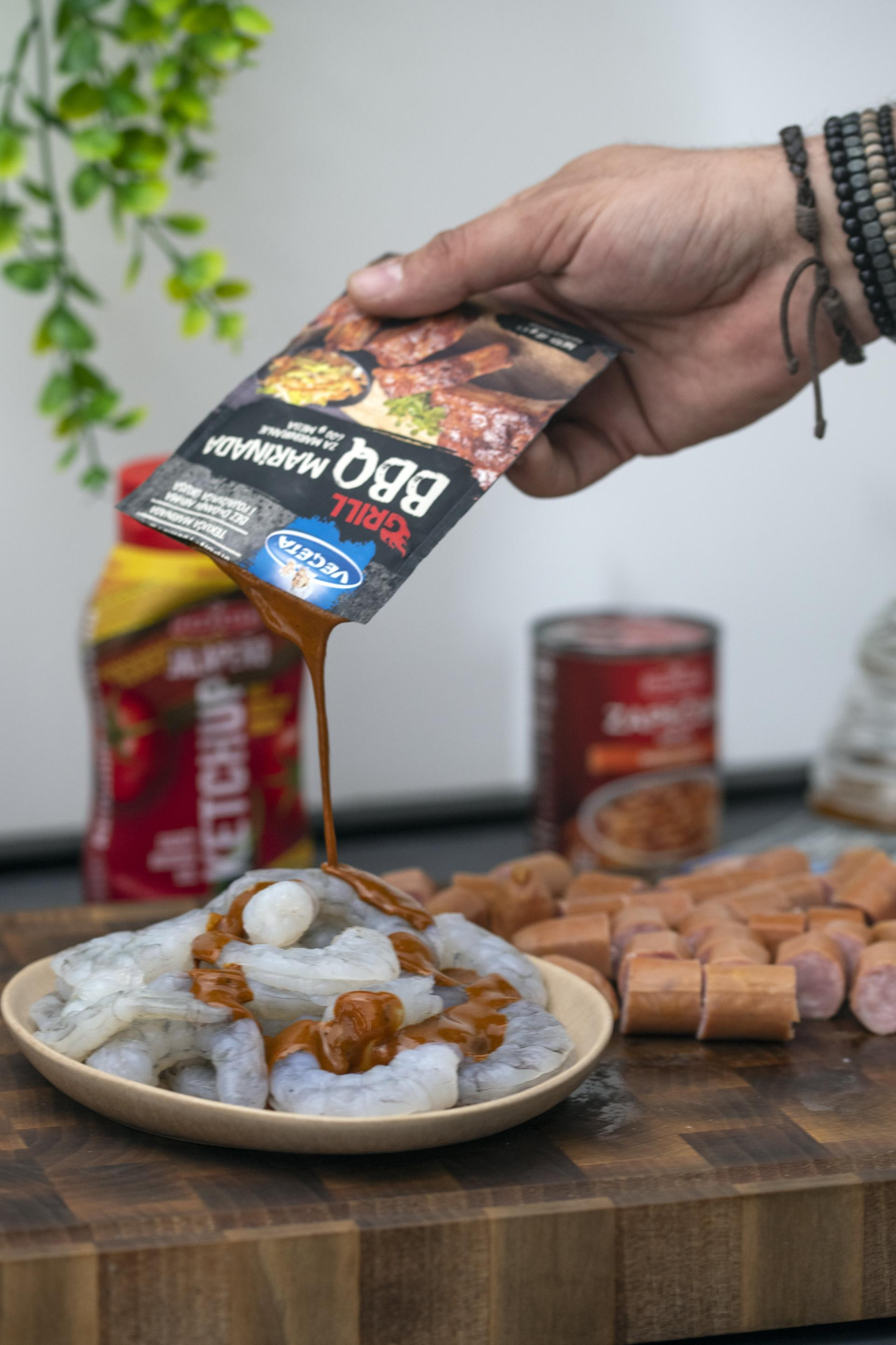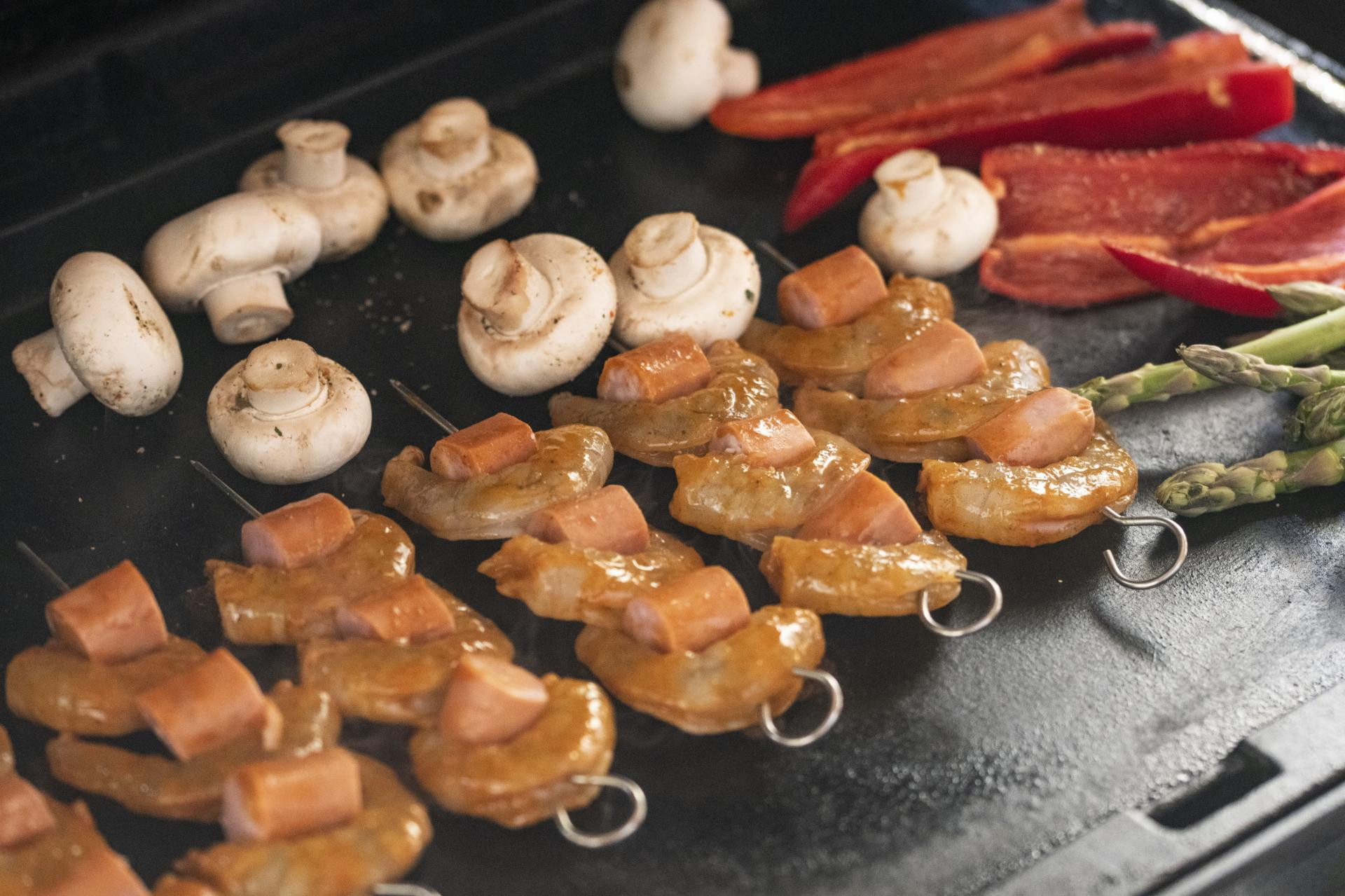 Repove kozica očistite i začinite s Podravka Vegeta Grill marinada BBQ marinadom. Kobasice narežite na malo deblje kolutiće te ih naizmjence s repovima kozica stavite na ražnjić štapiće. Povrće operite i očistite te ga začinite Podravka Vegeta Natur Grill Classic začinom.