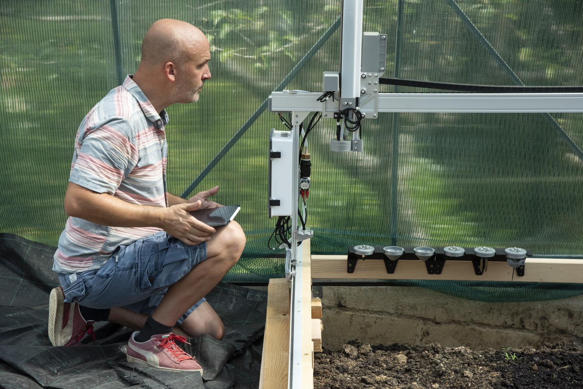 No, ono što smo ondje vidjeli nije tipična slika seoskog vrta. Po gredicama povrća, vrlo pažljivo i s namjerom, kreće se robot vrlo pamtljivog imena - Farmbot. Njime preko mobitela, odnosno posebne aplikacije, upravlja Ivan Decker (49), voditelj udruge Gradionica i pokretač ovog zanimljivog projekta. Prije nego smo voditelja išta upitali, fascinirano smo promatrali što robot radi: u jednom trenutku podiže alat, pomiče se po preciznom okviru, mjeri vlagu u zemlji pa zalijeva biljke, a počupa i poneki korov.
