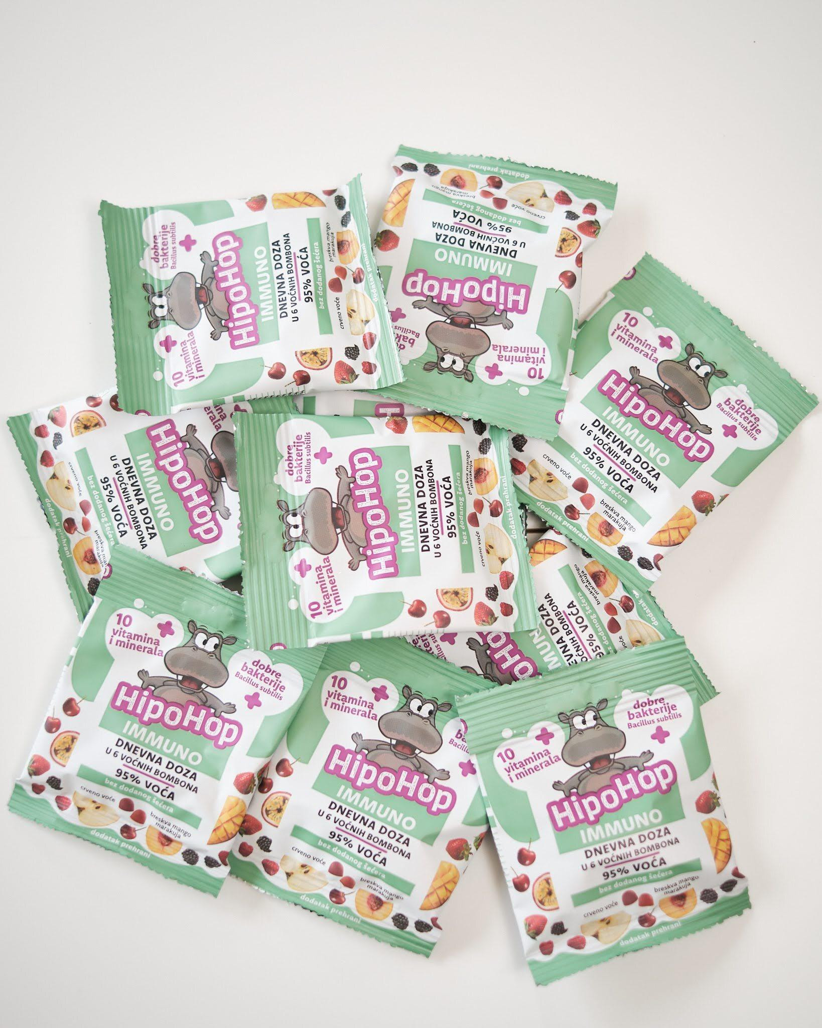 Zbog svog bogatog iskustva u razvoju hrane, znala je da se takav proizvod može napraviti drugačije i tako je nastao HipoHop Immuno. Svaka vrećica sadrži 100 g voća, a inovativnom tehnologijom uspjeli su očuvati hranjive tvari i prirodna vlakna. HipoHop također sadrži četiri milijarde probiotičkih bakterija Bacillus subtilis, koji je klinički ispitan na mikrobioti djece te 10 vitamina i minerala. Jede se kao voćna poslastica te je potpuno bez dodanih šećera, bojila, želatine i konzervansa.