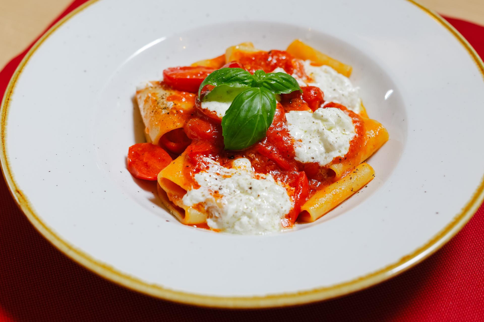 Pasta pomodoro e burrata nosi u nazivu sve ključne sastojke: široki komadi tjestenine upijaju aromatični umak od rajčica u kojem plivaju komadići lagano kuhanih cherry rajčica. Na svaku porciju stavlja se krema od burrate čija bogata, mliječna unutrašnjost nježno povezuje sve okuse. Listići bosiljka i tek mrvica papra na vrhu upotpunjuju doživljaj. Svaki komad paste zadrži dovoljno umaka, pa je zalogaj pouzdan spoj tekstura – od čvrste tjestenine do kremaste burrate i sočnih rajčica.
