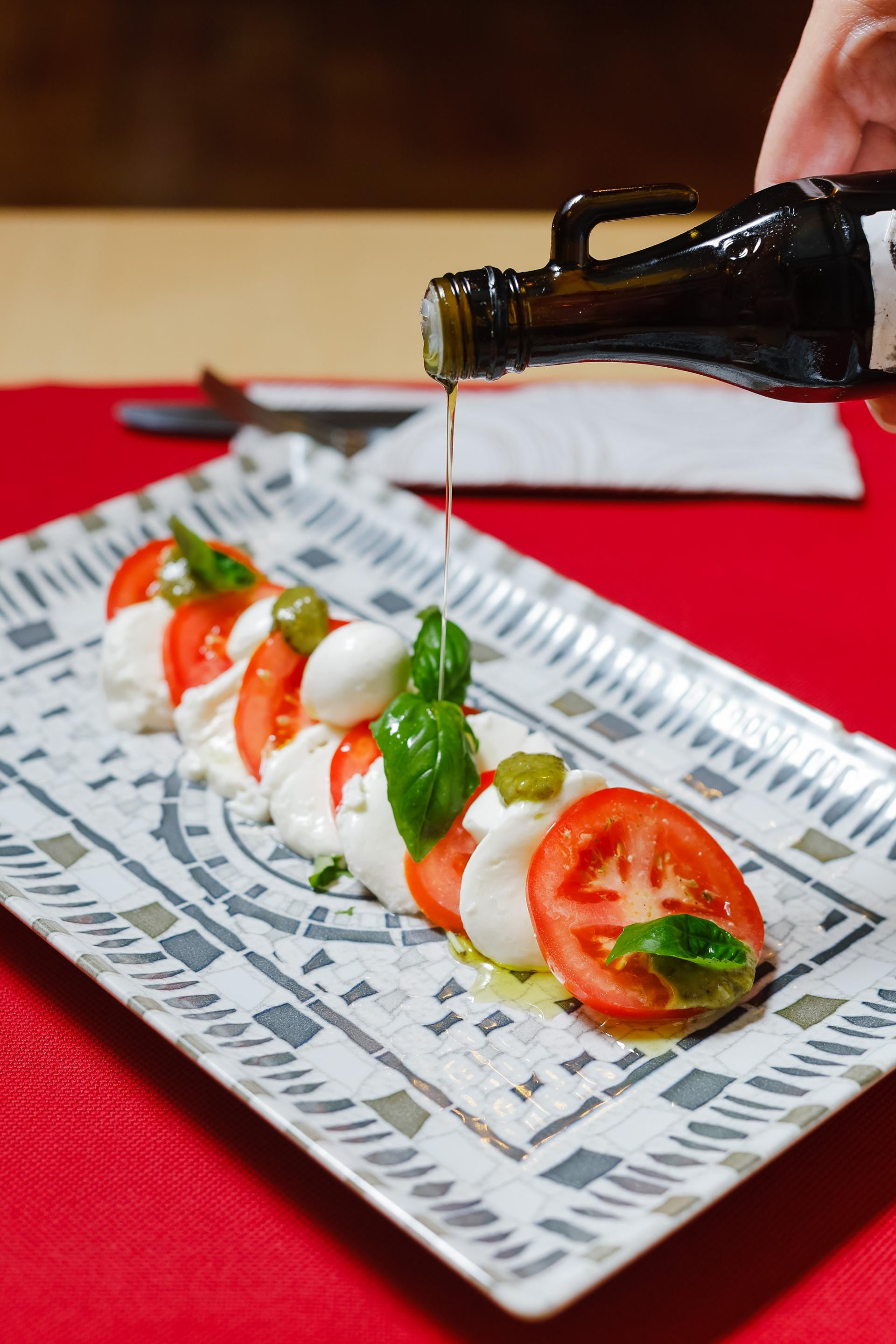 Vladi nam je pripremio još dva jela. Jedan klasik s menija, Caprese salatu, te pasta pomodoro e buratta. Caprese je bio pomno složen na tanjuru: naizmjence su poredane kriške sočnih rajčica i debele fete mozzarelle, a odozgo su posuti listići svježeg bosiljka i žličice zelenog pesta. Sve je to zaliveno hladno prešanim maslinovim uljem koje dodatno naglašava svježinu. Kombinacija zelene, bijele i crvene boje podsjeća na talijansku zastavu, a lagani, a opet pun okus svježih rajčica čini ovo jelo savršenim onako kako za to vele – „jer oči jedu“.