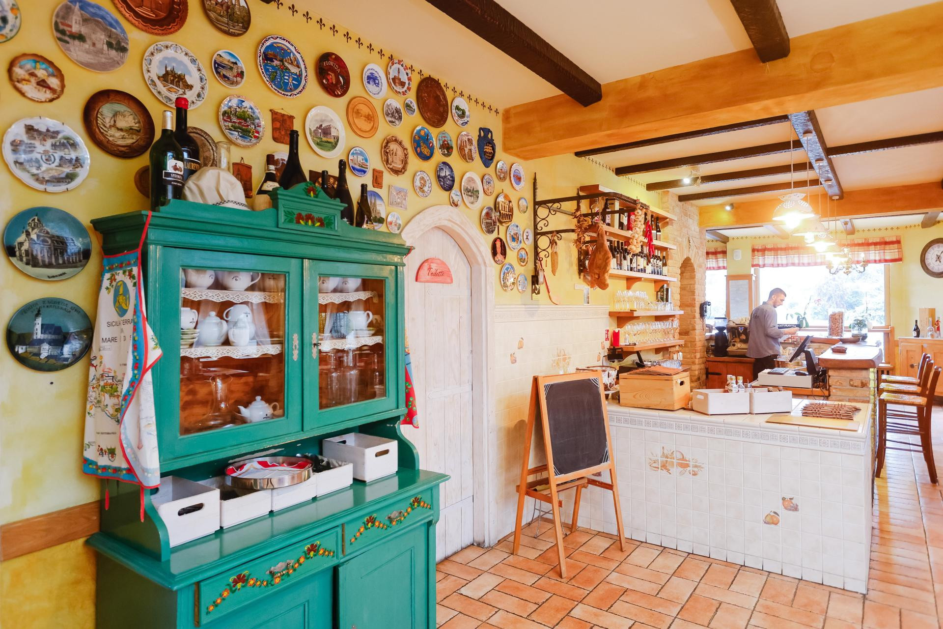 Antonio nas je proveo kroz interijer. U jednom kutu nalazi se drveni ormarić s pipom - starinski frižider u koji su se umetali veliki blokovi leda za hlađenje. Restoran krasi namještaj iz nonninog stana i vitrine stare barem stotinu godina. Klavir s kraja 19. stoljeća došao je iz Beča, pa je jedan od rijetkih objekata koji korijene ne vuče iz Italije. Antonijev nonno skupljao je male bočice alkoholnih pića.
