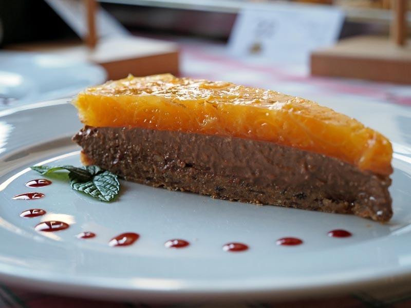 Način izrade: U posudu staviti 6 jaja i 200 g šećera. Miješati dok se ne sjedini. Samljeti 500 g naranče te u nju dodati jaja i šećer, zatim dodati sjeckane bademe, prašak za pecivo, brašno i kakao. Peći na 180 stupnjeva 40 minuta. Biskvit ohladiti pa prerezati na dva jednaka dijela. Mandarine samljeti u multipraktiku pa procijediti kroz sito. 800 ml soka od mandarine kuhati a ostatak pomiješati sa pudingom od vanilije, vanilin šećerom i šećerom. Ovu smjesu dodati u zagrijani sok i kuhati kao puding. Kad se krema skuhala, maknuti s vatre i dodati 100 g maslaca. Miješati dok se ne rastopi. Želatinu dodati u kremu prije samog slaganja. Šećer i žumanjke pomiješati mikserom pa kuhati na pari 13 minuta. Ohladiti te u posudu pomiješati izmiksano vrhnje za šlag i mascarpone te dodati ohlađenu smjesu od žumanjaka i šećera.