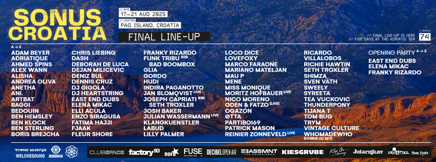 Odbrojavanje za Sonus Croatia 2025 je započelo! Program je sada potpun — pažljivo izbalansirana kombinacija međunarodnih trendsetera i pažljivo odabranih regionalnih izvođača koji će nastupati na sunčanom raju otoka Paga od 17. do 21. kolovoza 2025. U suradnji s vodećim svjetskim organizatorom događanja Insomniac, Sonus Croatia nudi savršeni spoj glazbenog bijega i putničke avanture uz besprijekornu produkciju i zvuk. Trenutno su dostupne regionalne regularne festivalske i Vip festivalske ulaznice putem web stranice organizatora https://we-love-sound.com/sonus-croatia Dnevne ulaznice bit će dostupne od idućeg tjedna.