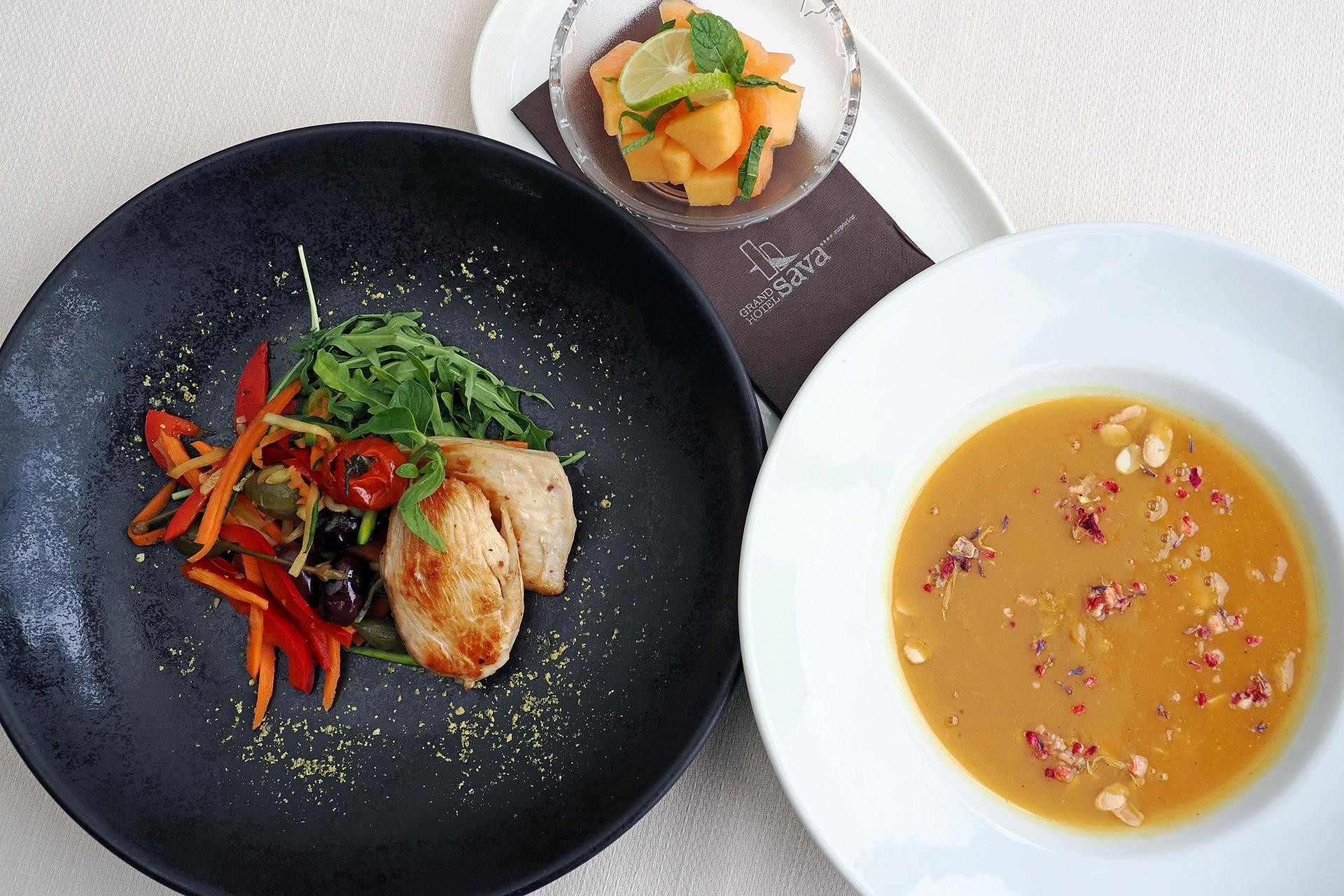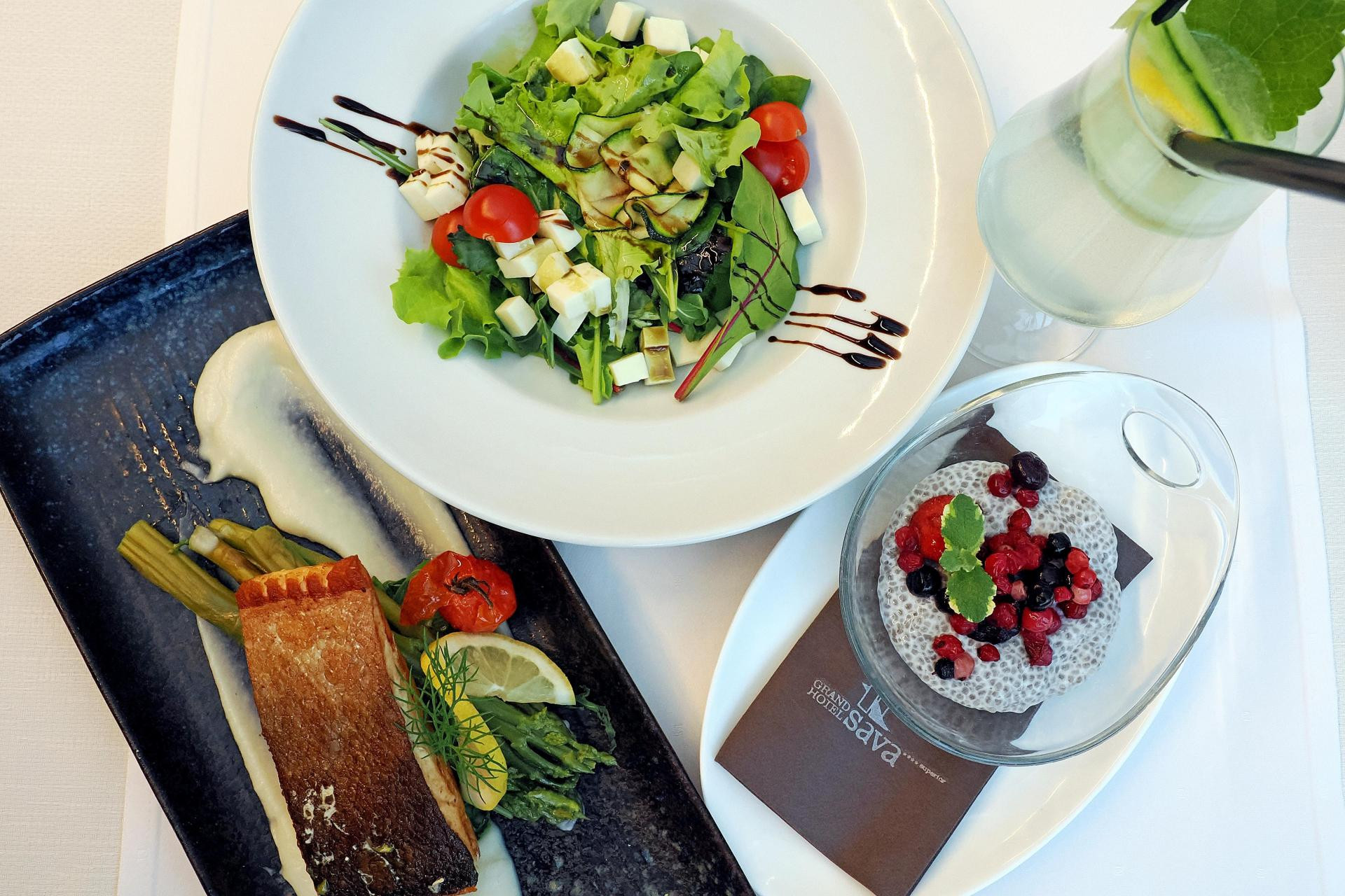 Matjaž Kovačič, F&B menadžer, sa svojim timom kreirao je wellness obroke u tri slijeda kombinirajući sezonske namirnice koje ne sadrže ugljikohidrate i šećere. Tako je dan potrebno ‘prelomiti‘ ručkom koji počinje krem juhom od buče s listićima badema, za glavno jelo tu su pileći medaljon na žaru s mediteranskim povrćem a desert svježa dinja ili ananas u soku od limete s mentom.