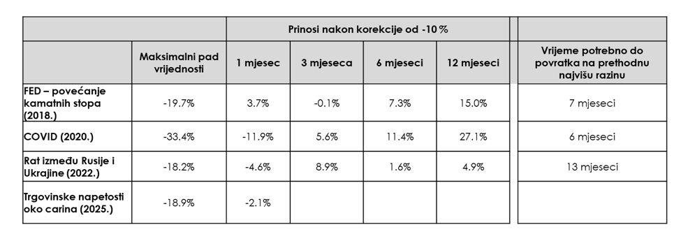 Prvi mjeseci 2025. godine obilježeni su iznimnom volatilnošću tržišta dionica, potaknutom stalnim i često kontradiktornim izjavama administracije Donalda Trumpa. Američka tržišta dionica pala su s najviših razina sredinom veljače i do sredine ožujka izgubila gotovo 20%, prije nego što su u travnju nadoknadila oko dvije trećine tog pada. U svibnju su dodala još 6% rasta, promatrano kroz S&P 500 indeks, zaključivši mjesec na otprilike 4% nižim razinama od maksimuma iz veljače. U nesigurnim tržišnim okolnostima ulagatelji često osjećaju potrebu za prodajom, uz plan ponovnog ulaganja kada se tržište stabilizira – no takva strategija najčešće rezultira ispodprosječnim povratima. U financijska tržišta, osobito u tržište dionica, treba ulagati s dugoročnom perspektivom, zanemarujući kratkoročne oscilacije. Kao što ćemo prikazati u nastavku, strategija tijekom korekcije često je – ne poduzimati ništa; u velikoj većini slučajeva korekcije su kratkotrajne, a tržišta se u roku od nekoliko tjedana ili mjeseci vraćaju na uzlaznu putanju.