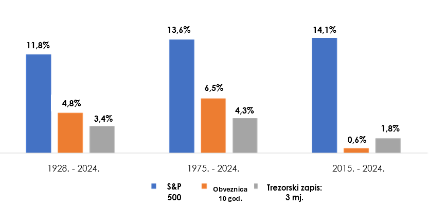 Primjerice, tijekom posljednjih 50 godina, od 1974. do 2024., dionice mjerene kroz indeks S&P 500 ostvarivale su prosječan godišnji prinos od 13,6%, dok su 10-godišnje obveznice u prosjeku donosile 6,5%, a novčana sredstva (3-mjesečni trezorski zapisi) 4,3%. Ovo zlatno razdoblje od pola stoljeća uključivalo je i šok „Crnog ponedjeljka” 1987. (s padom od 20% S&P 500 indeksa) te „Tehnološki balon” 2000. godine (s padom od 46% nakon razdoblja nerazumne euforije i višegodišnjih dvoznamenkastih prinosa tijekom kasnih 1990-ih).