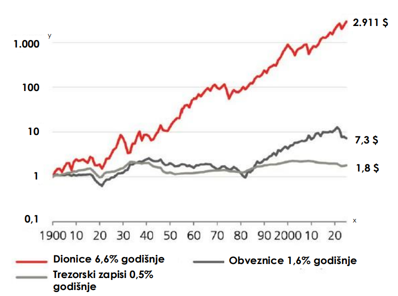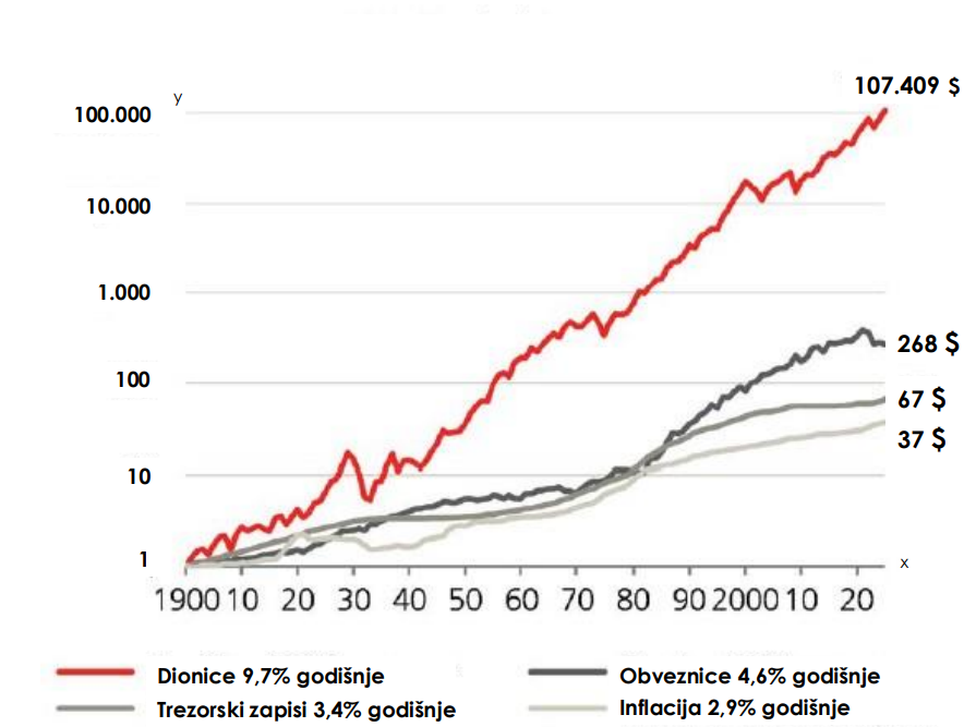 - Jedan dolar uložen na američkom tržištu 1900. godine donio bi vrijednost ulaganja od 107.409 USD do 2024. godine. Usporedbe radi, slična ulaganja u druge klase imovine donijela bi znatno nižu vrijednost ulaganja: 268 USD za ulaganje u obveznice, 67 USD za ulaganje u trezorske zapise – što su prilično skromni rezultati s obzirom na gubitak kupovne moći tijekom istog razdoblja (1 USD iz 1900. imao je tadašnju kupovnu moć kao današnjih 37 USD).