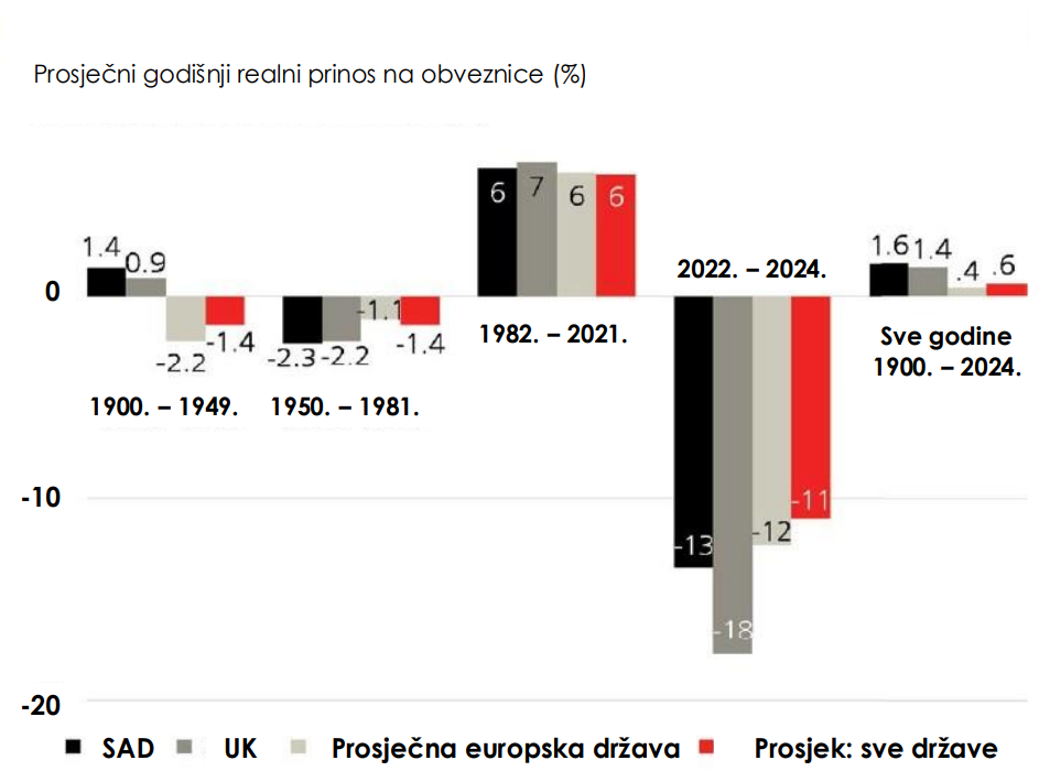 Grafikon 4 Realni prinosi obveznica u različitim razdobljima (UBS Global Investment Returns Yearbook: Public summary edition 2025)