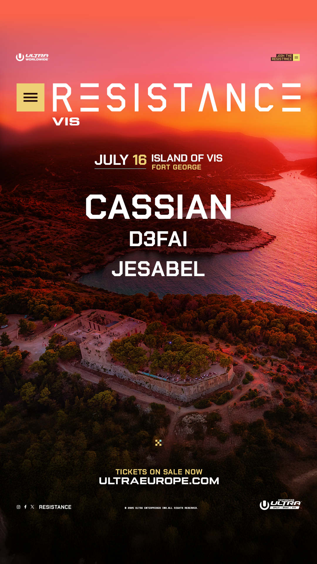 Destination ULTRA svoje završno poglavlje i ove će godine ispisati na Visu - otoku mira, autentičnosti i skrivenih ljepota. RESISTANCE VIS, koji se održava 16. srpnja unutar impresivnih zidina tvrđave Fort George, donijet će ekskluzivno boutique iskustvo za samo 2000 posjetitelja. U ovom jedinstvenom ambijentu publiku očekuje nastup australskog producenta Cassiana, jednog od najcjenjenijih predstavnika melodičnog house zvuka današnjice. Njegova glazba, objavljena na prestižnom labelu Rose Avenue (RÜFÜS DU SOL), poznata je po toplim teksturama, emocionalnoj dubini i savršenom balansu klupskog ritma i glazbene introspekcije. Prethodit će mu nastup D3fai, argentinskog DJ-a poznatog po eksplozivnoj mješavini progressive i electro house zvuka te Jesabel, talentirana australska DJ-ica i producentica čiji se nastupi modernim pristupom house glazbi. Ulaznice su u prodaji po cijeni od 25€.