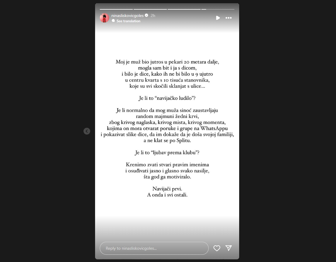 "Moj je muž bio jutros u pekari 20 metara dalje, mogla sam biti i ja s djecom, i bilo je djece, kako ih ne bi bilo u 9:00 ujutro u centru kvarta s 10 tisuća stanovnika, koje su svi skočili sklanjat s ulice... Je li to ‘navijačko ludilo‘? Je li normalno da mog muža sinoć zaustavljaju random majmuni žedni krvi, zbog krivog naglaska, krivog mjesta, krivog momenta, kojima on mora otvarati poruke grupe na WhatsAppu i pokazivati slike djece, da im dokaže da je došao svojoj familiji, a ne klati se po Splitu?", napisala je ljutita i ogorčena Nina Slišković Goleš na Instagramu.