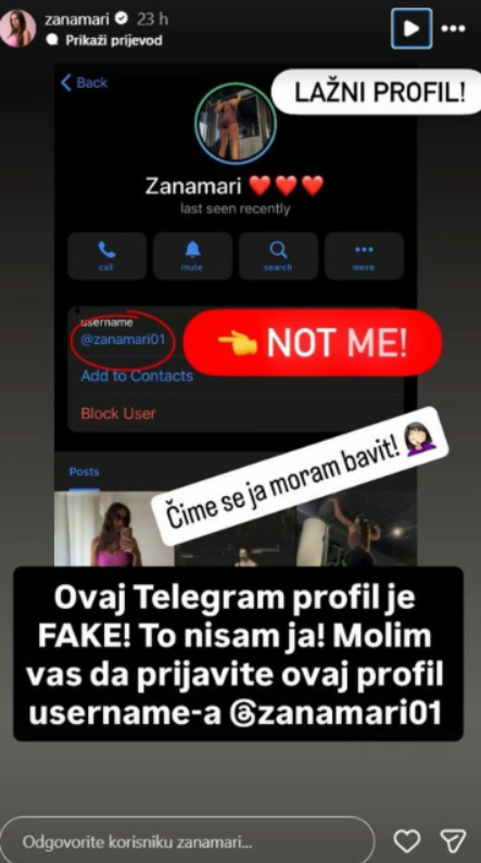 - Ovaj Telegram profil je FAKE! To nisam ja! - poručila je u svojoj Instagram priči, u kojoj tvrdi kako se iza profila s korisničkim imenom @zanamari01 krije lažna osoba. - Čime se ja moram baviti! - dodala je frustrirano.