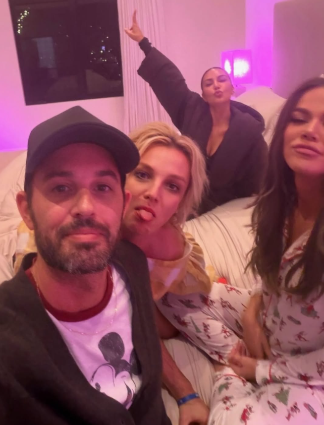 45-godišnja reality zvijezda Kim također je objavila dvije Instagram priče s druženja, na kojima je bila i njezina mlađa sestra Khloe. Spearsin dugogodišnji bliski prijatelj Cade Hudson, za kojeg se kaže da trenutno obnaša dužnost njezina menadžera, također je bio dio glamuroznog prespavanca. Dok je Kim zauzela svoju klasičnu selfie pozu i napućila usne, Spears je napravila mrzovoljno lice i isplazila jezik za selfie koji je očito fotografirao Hudson.