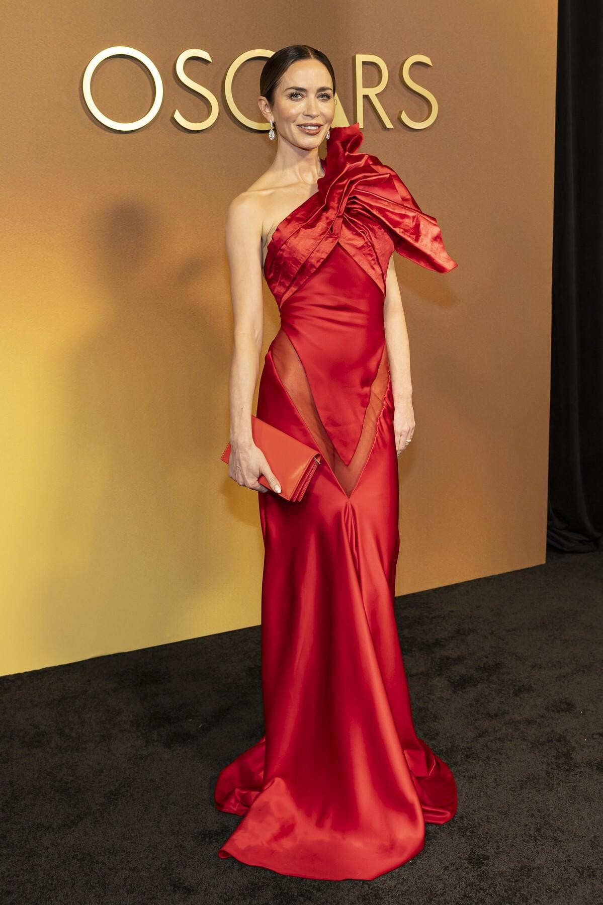 Britanska glumica, Blunt, rijetko kada pogriješi sa svojim modnim kombinacijama, tako da je pomalo šokantno kako je uspjela odabrati ovako spornu haljinu. Haljina je imala prilično avangardne detalje na dekolteu koji su podsjećali na veliku zgužvanu mašnu kraj njezine glave. Jarko crvena duga haljina također je imala prozirne otvore u obliku slova V neobično postavljene od bokova do unutarnje strane bedara. Njezina smeđa kosa bila je skupljena u punđu dok je dopuštala svom prirodnom izgledu da zablista uz odgovarajuću šminku.